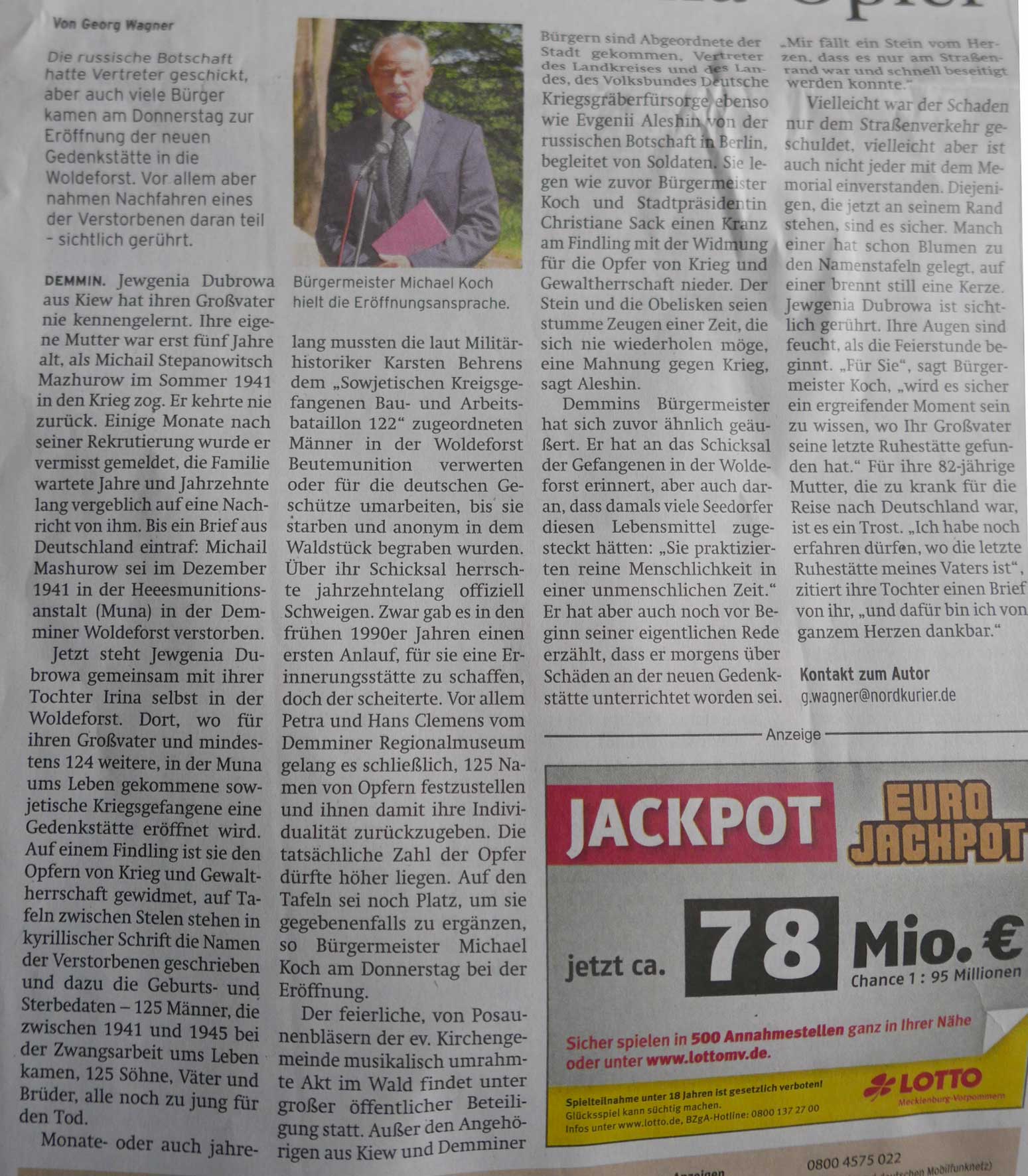 Der damalige Von Rohr im Haus Demmin, der Ruine nun über der Stadt, kam ins KZ weil er am Grabe eines solchen Russen, auf seinem Gut, gewagt hatte aus der Bibel zu sprechen und zu beten, Der heutige Bürgermeister. aus Demmin, ein gottesfürchtiger Mann, wagt nicht aus der Bibel zu lesen oder zu beten. Den Dank, der hier von der Russin dann kommt, mit einem Wort aus der Bibel hätte es sie sicher als besonders verbindend verstanden.