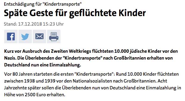 Als Teil der deutschen Entschädigungspolitik nach dem Zweiten Weltkrieg erhalten Opfer der nationalsozialistischen Verfolgung Geldzahlungen. Das Bundesentschädigungsgesetz gewährt seit 1953 Personen, die während des Nationalsozialismus in Deutschland aus politischen, rassistischen, religiösen oder aus weltanschaulichen Gründen verfolgt wurden, eine finanzielle Entschädigung. Bis Ende 2017 wurden Entschädigungen für nationalsozialistische Verbrechen in Höhe von über 75 Milliarden Euro gezahlt.