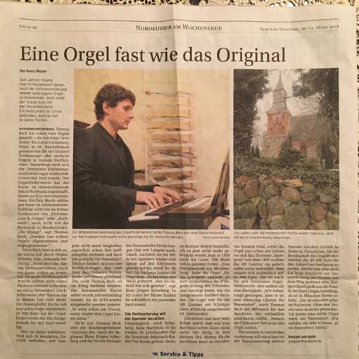 seit heute Überweisung der restlichen 20 000 Euro an die Freunde der Kirche und Natur in Nosssendorf. Damit sind alle 70 000 Euro zur Wiederherstellung der Orgel nun von diesem Spender eingegangen.
