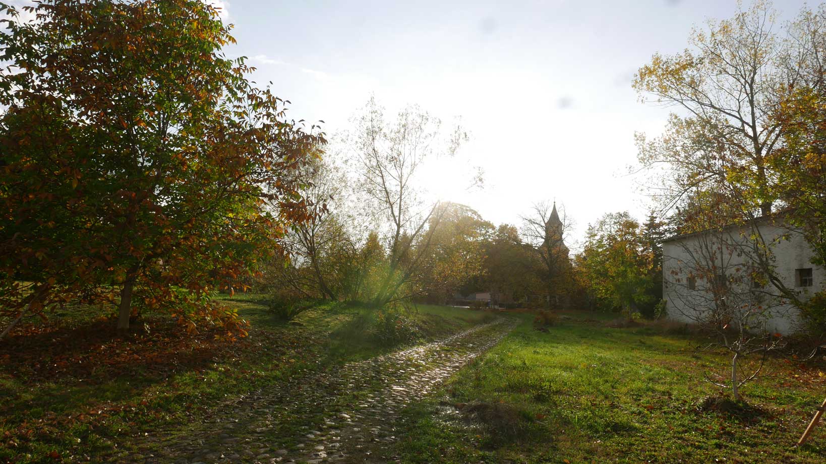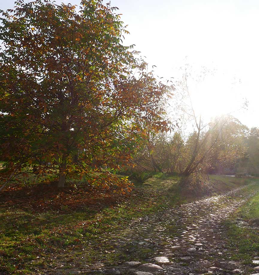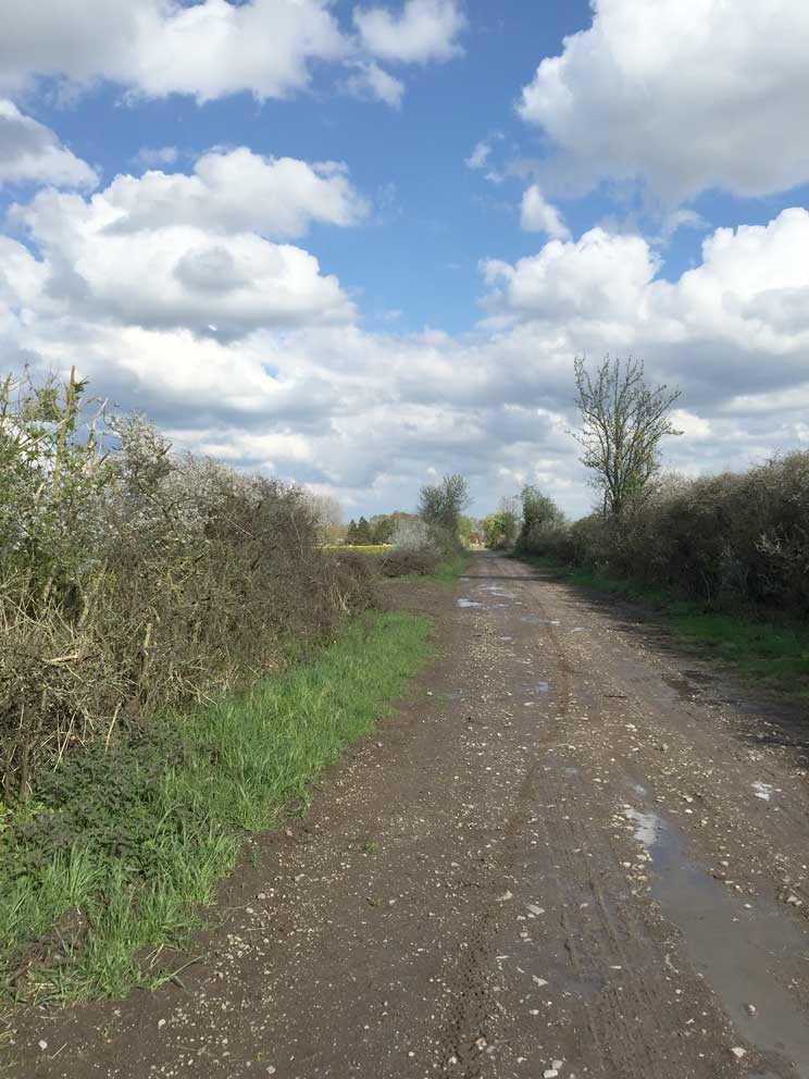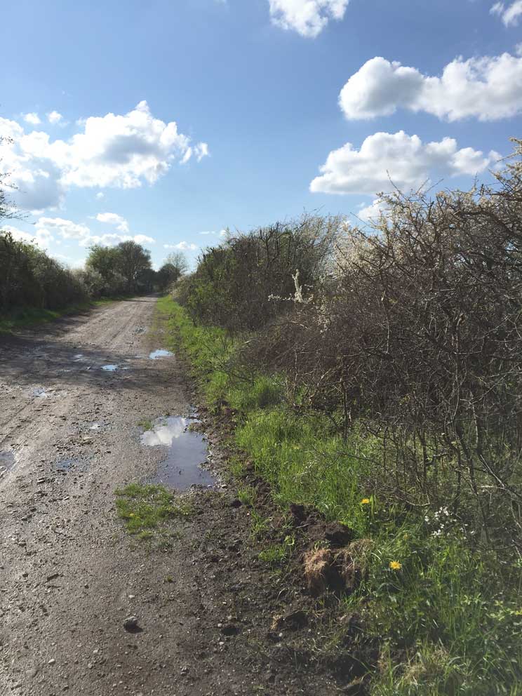 ein Landweg mit Hecken und natürlichem Baumbestand
