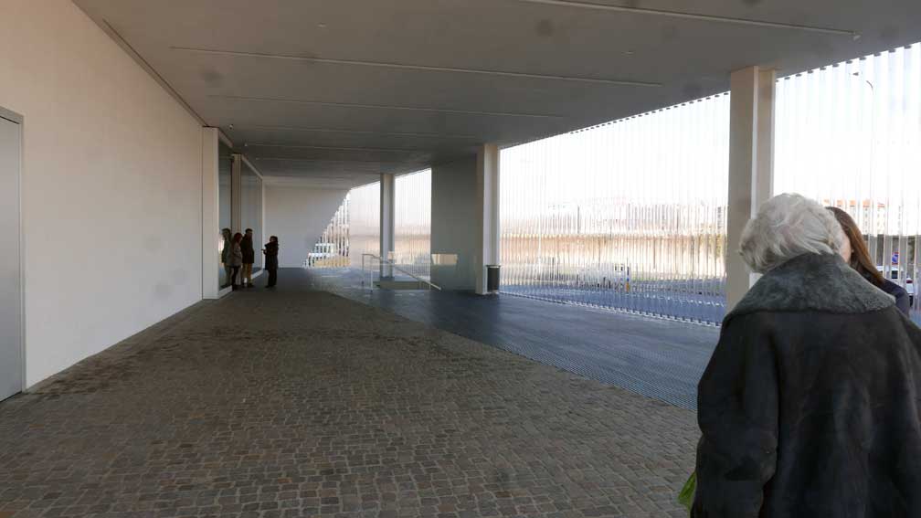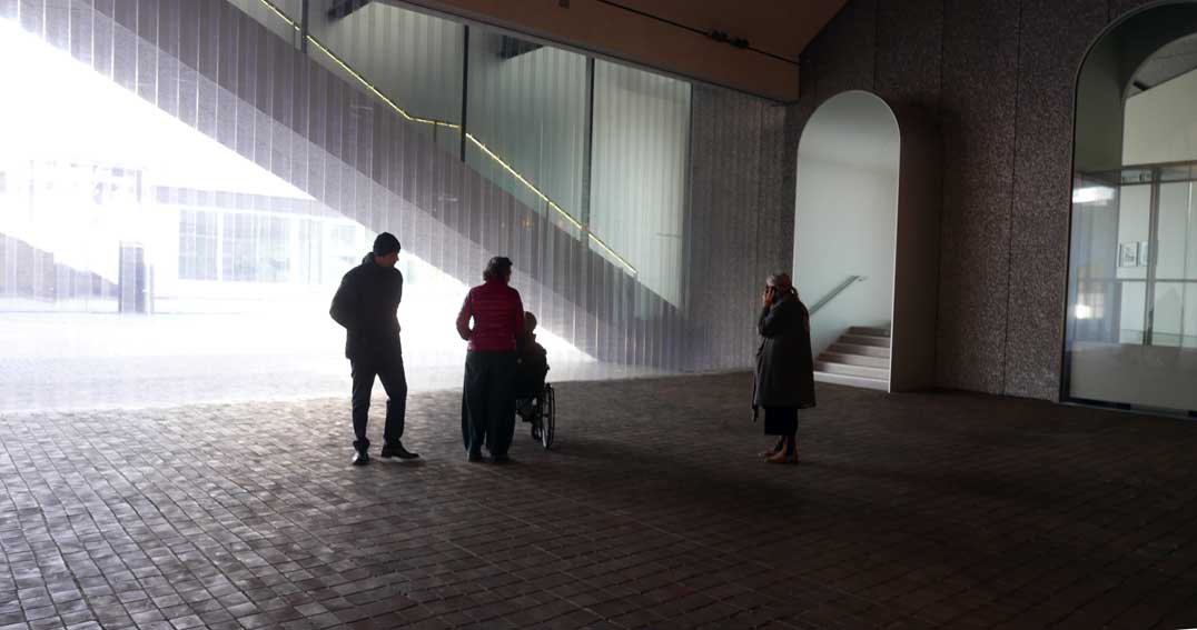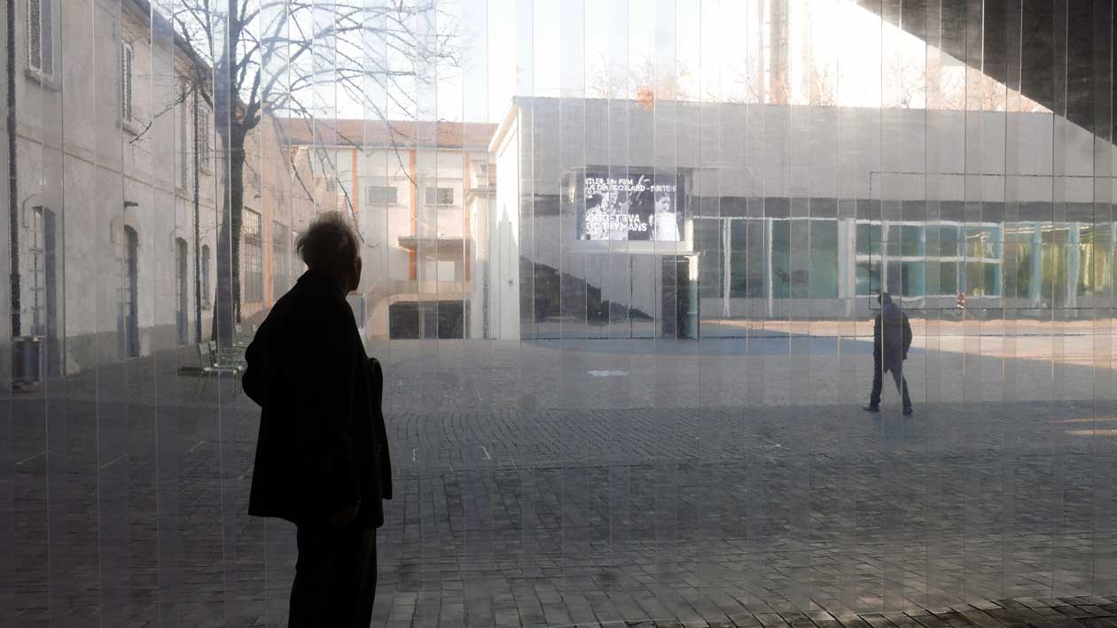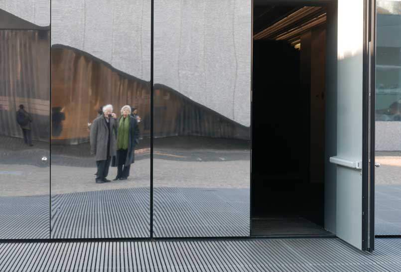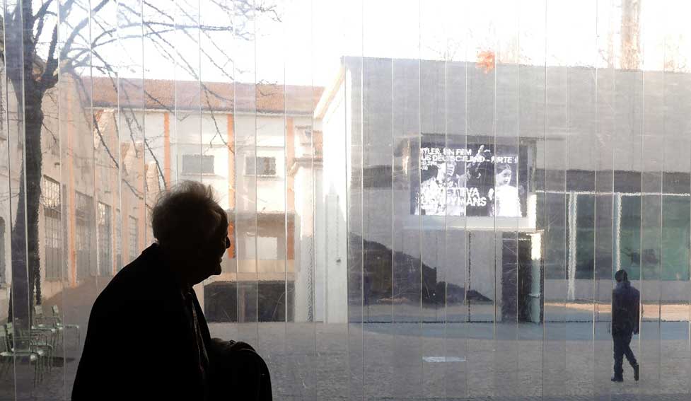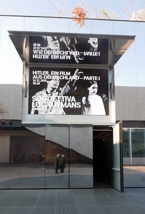 Der Eingang zum dunklen Kino zeigt das Haus von aussen verspiegelt hell