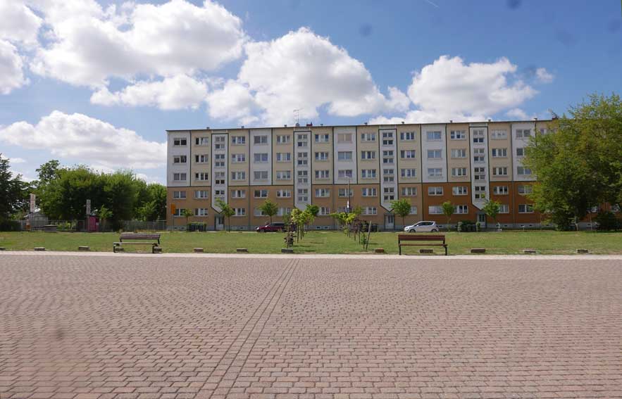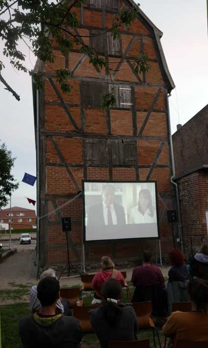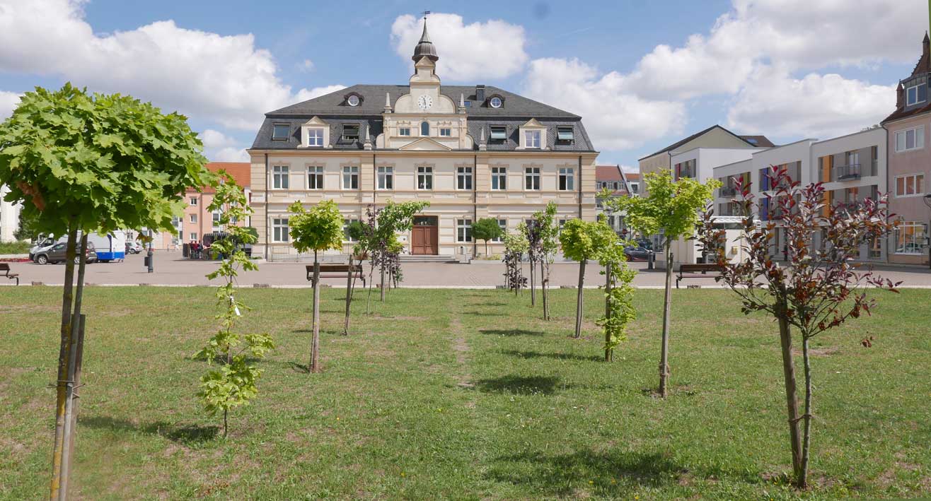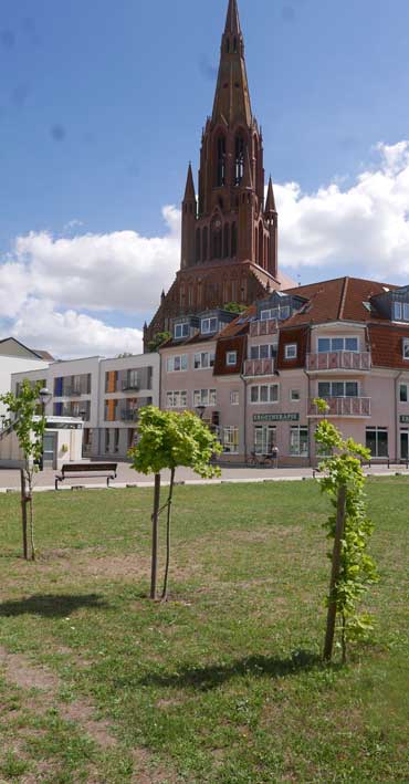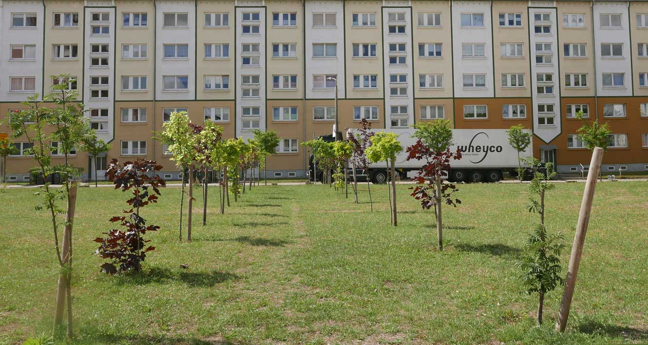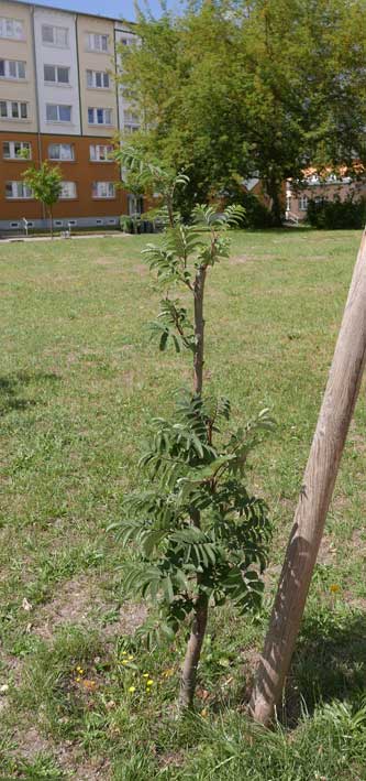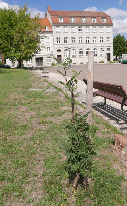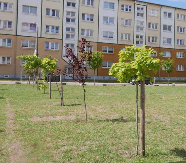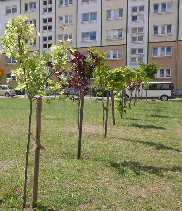 vor 3 Jahren entstanden sind diese Bäume entlang des Gangs, der dort zwischen den Häusern hier früher bis 1945 verlief. Die Spur zeigt den Menschen wo. Studenten aus Norwergen haben sie geholt, Bürger gespendet, wir gepflanzt.