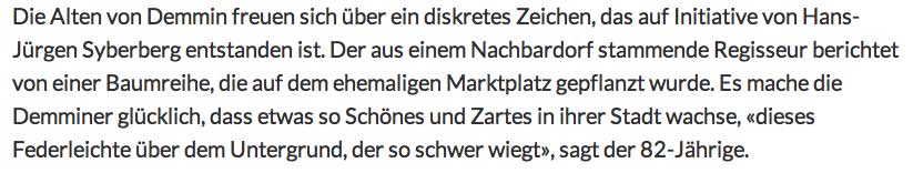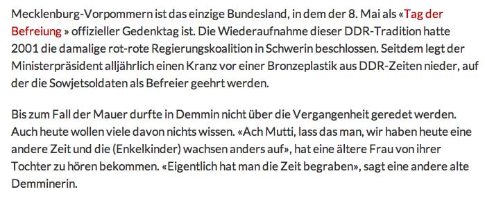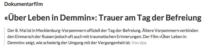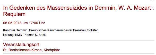 Heute wird nun in Demmin der Film von Farkas über Demmin vor den Demminern offiziell uraufgeführt. Und man wir sie sehen und reden hören auch von 45. Endlich. Und es wird in diesem Jahr endlich eine Feier der Toten auch auf der öffentlichen Seite der Stadt angekündigt geben in der Kirche und mit dem Requiem von Mozrat. So schliessen sich die Wunden. Offen für alle.