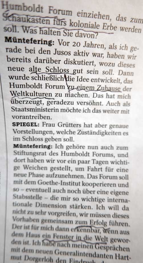 Das Humboldt Forum genannte Objekt ohne Humboldt und kein Schloss mehr, dessen Chancve sie verkannten, wird nun zur Kampfzone der Arbeit suchenden Provenienzforscher, im Ausland doch interessant. Als Krampf dessen, was es hä#tte sein müssen und vprgestzt wie das gepresste Heu und Kraftfutter den Tieren im gefesselten Beton-Stall zum Fressen vorgeworfen.