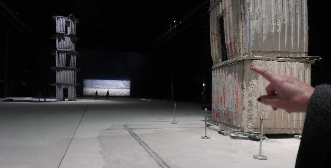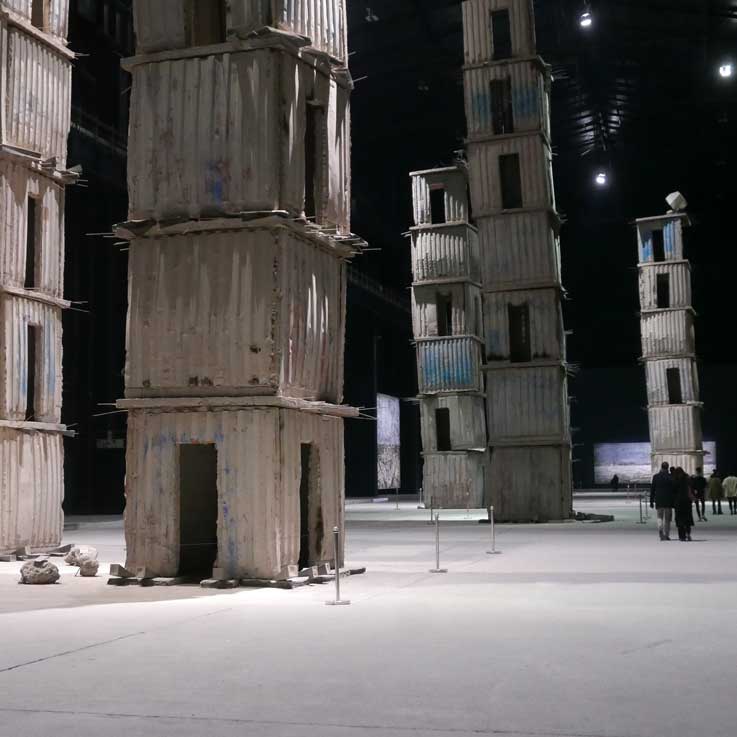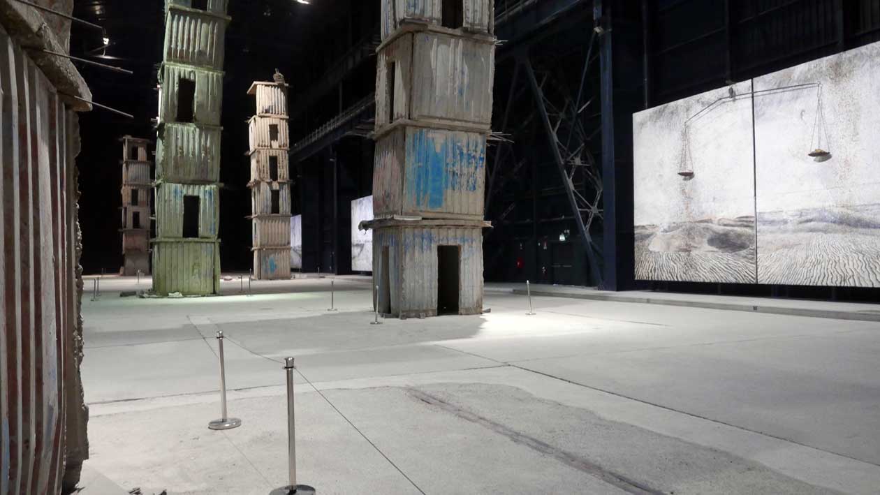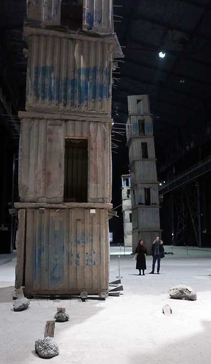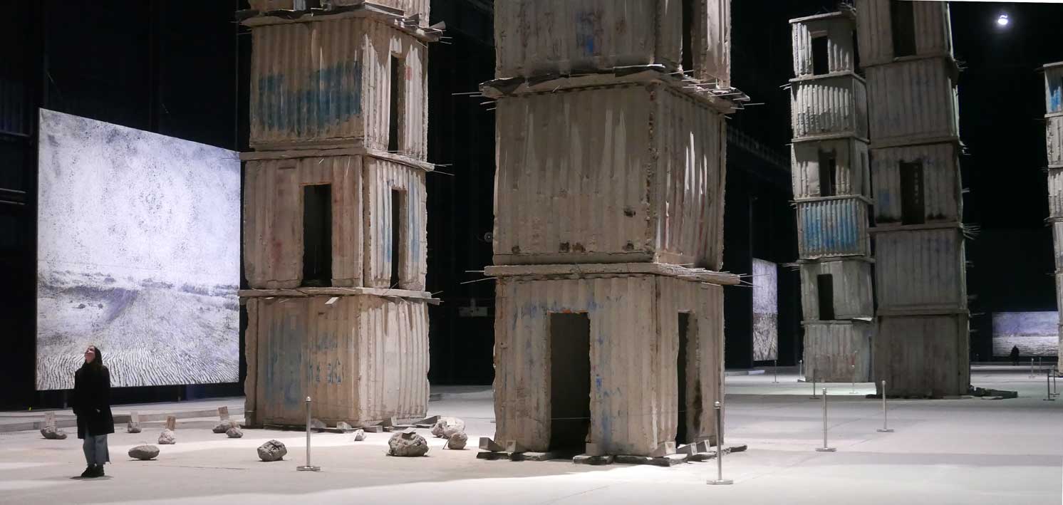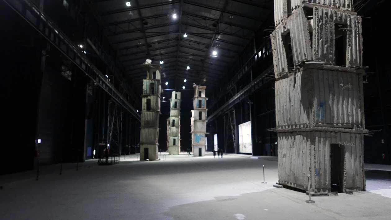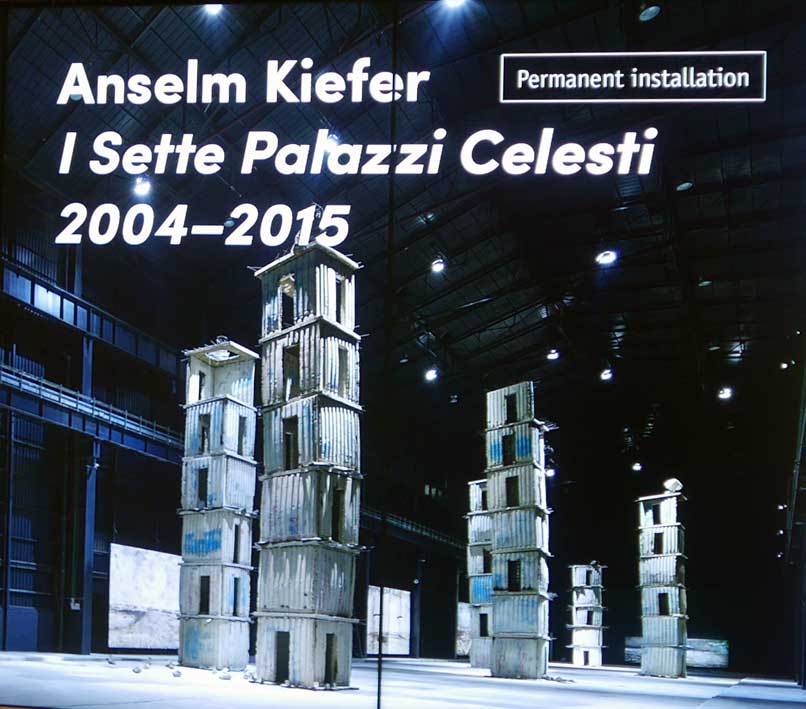 Eine Halle mit Zwischen Wänden gehägt und darin Anselm Kiefer mit seinen Türmen.