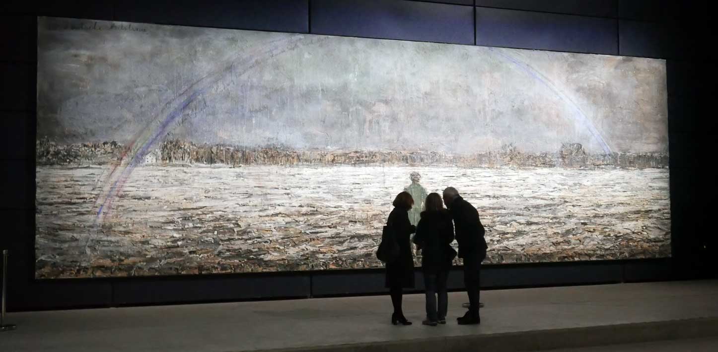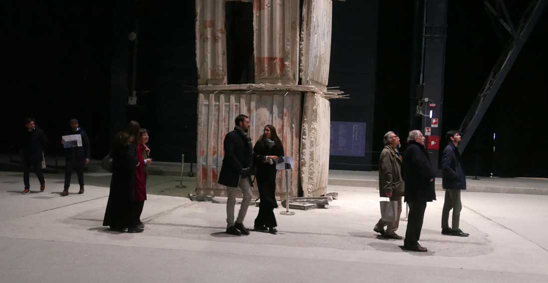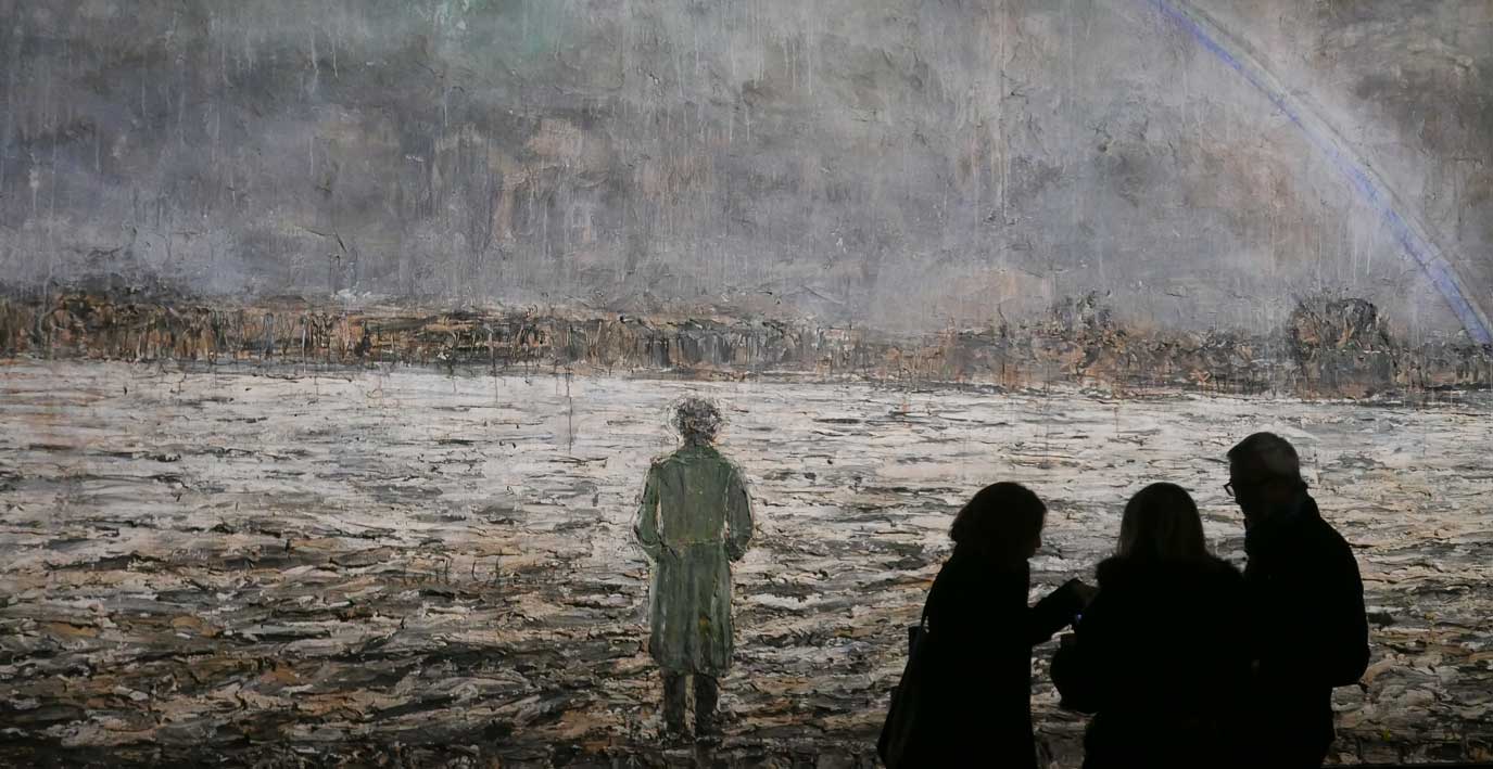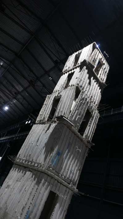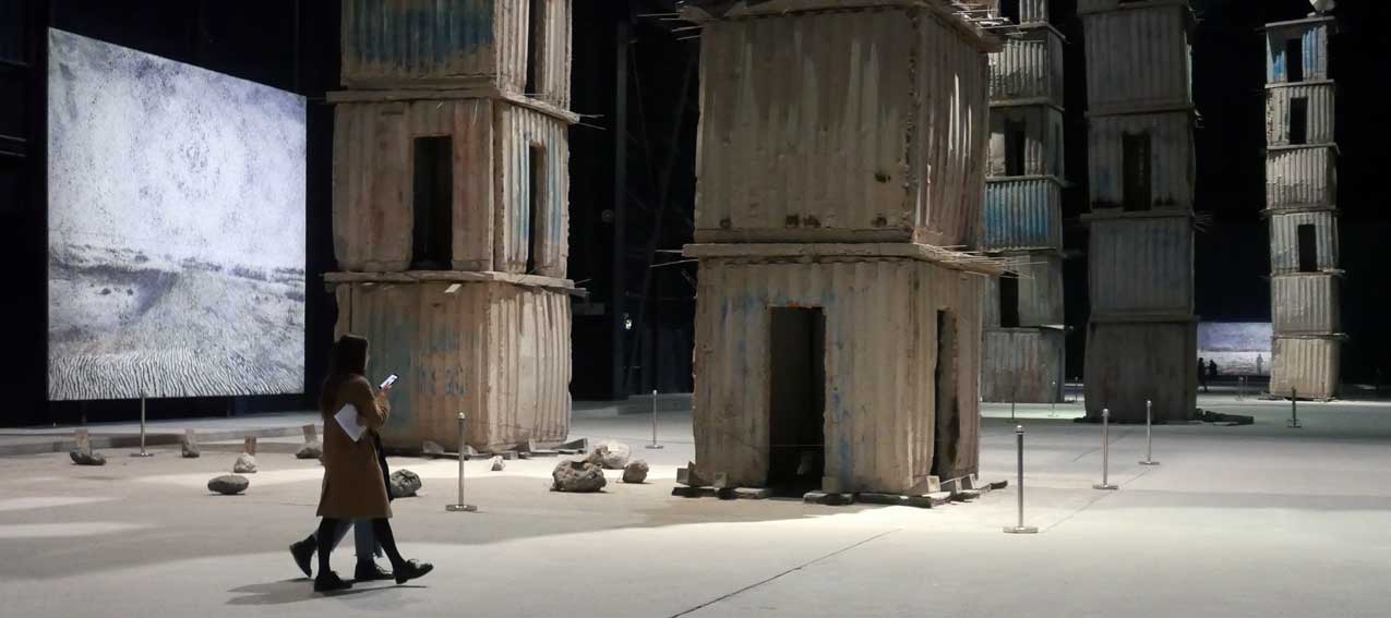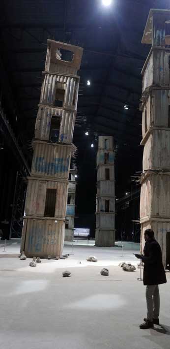 Eine Halle mit Zwischen Wänden gehägt und darin Anselm Kiefer mit seinen Türmen.