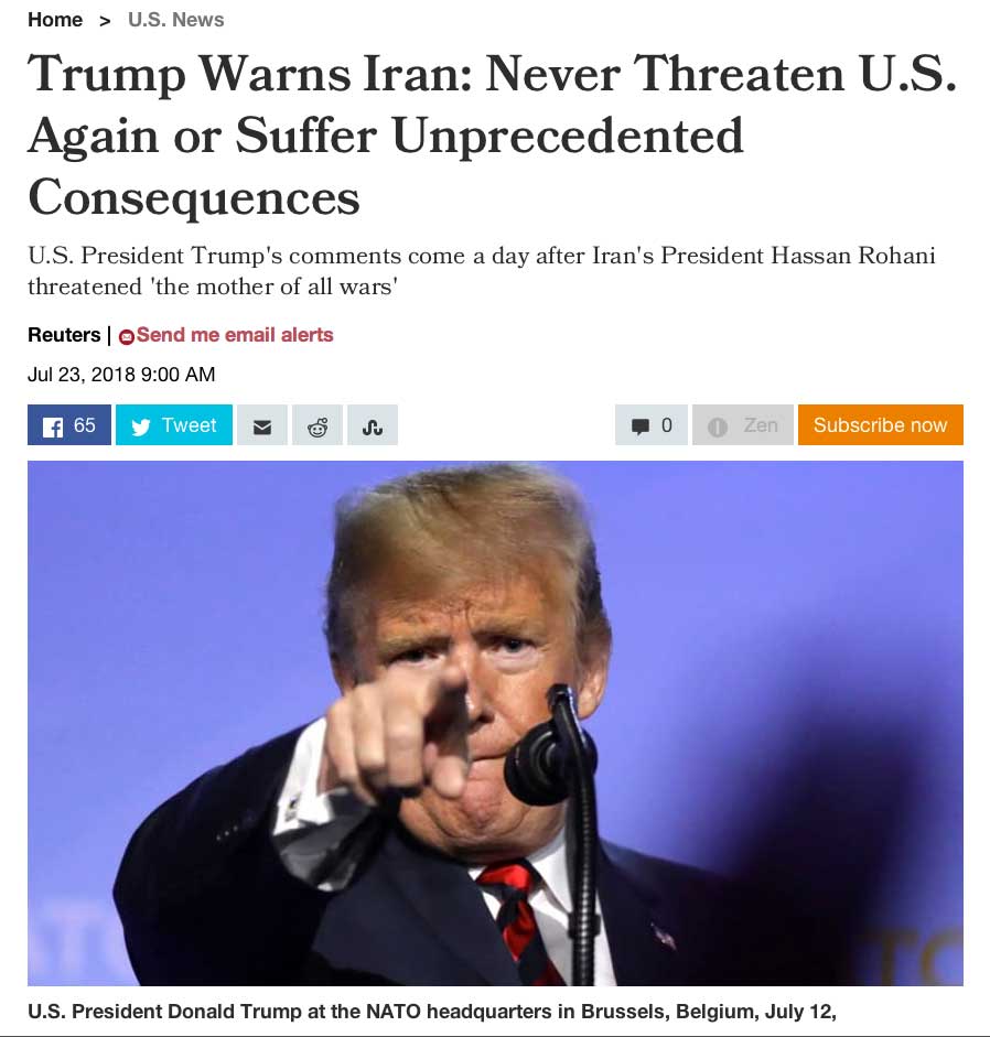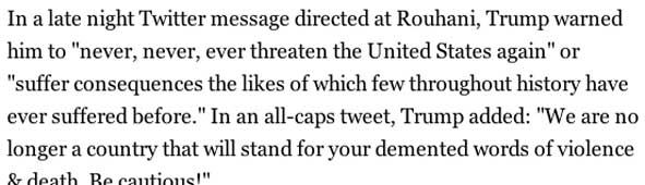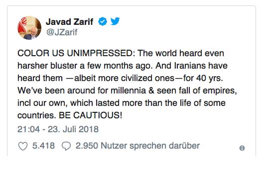 Irans Aussenminister Mohammed Dschawad Sarif ebenfalls via Twitter. "Wir sind nicht beeindruckt", schrieb er an Trump gerichtet auf Englisch - und ebenfalls in Grossbuchstaben. "Wir sind seit Jahrtausenden da und haben den Untergang von Imperien gesehen, unser eigenes eingeschlossen, das länger währte als das Leben mancher Länder", schrieb Sarif weiter. Für den Schluss der Kurznachricht wählte er in Grossbuchstaben dieselben Worte, die zuvor Trump in seinem Tweet an Rohani genutzt hatte: "Seien Sie vorsichtig!"