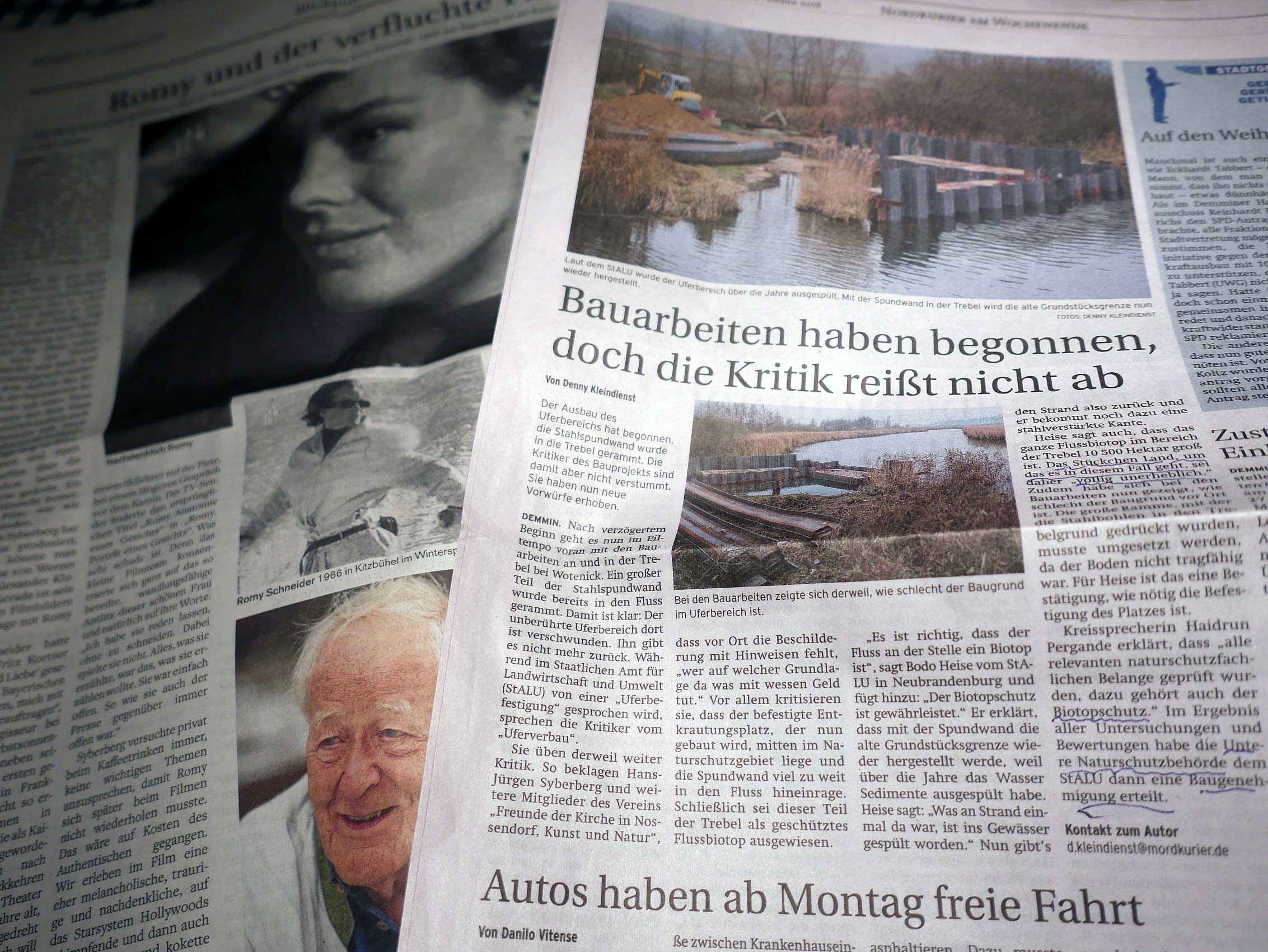 in Schwerin (Volkszeitung/ SVZ)die Romy als Film eine Seite voll wie sie nach Demmin kam nach über 50 Jahren aus den Bergen und sich nun wundern kann, was sie hier mit ihren Flüssen und Morren , dem Schatz des Lanes gemacht.