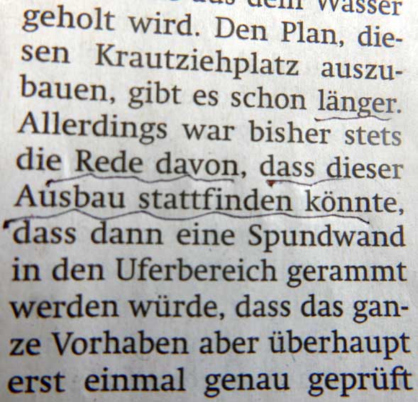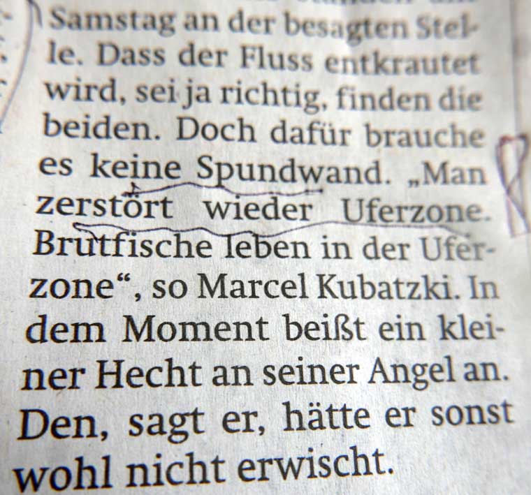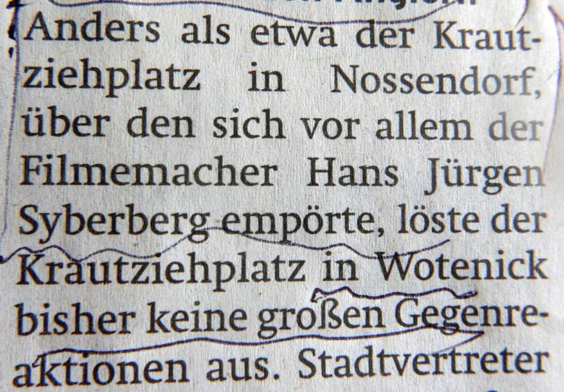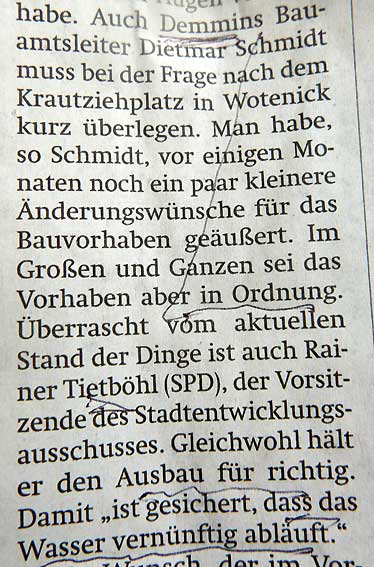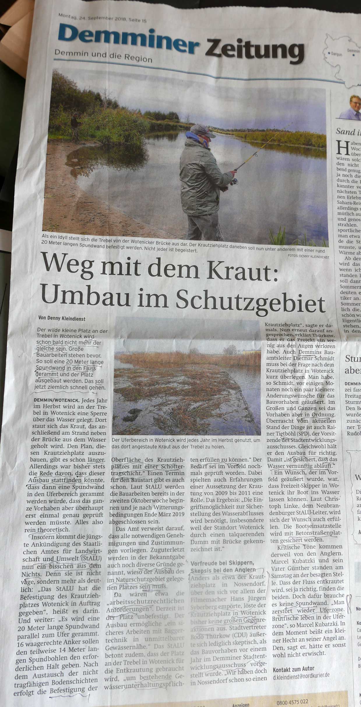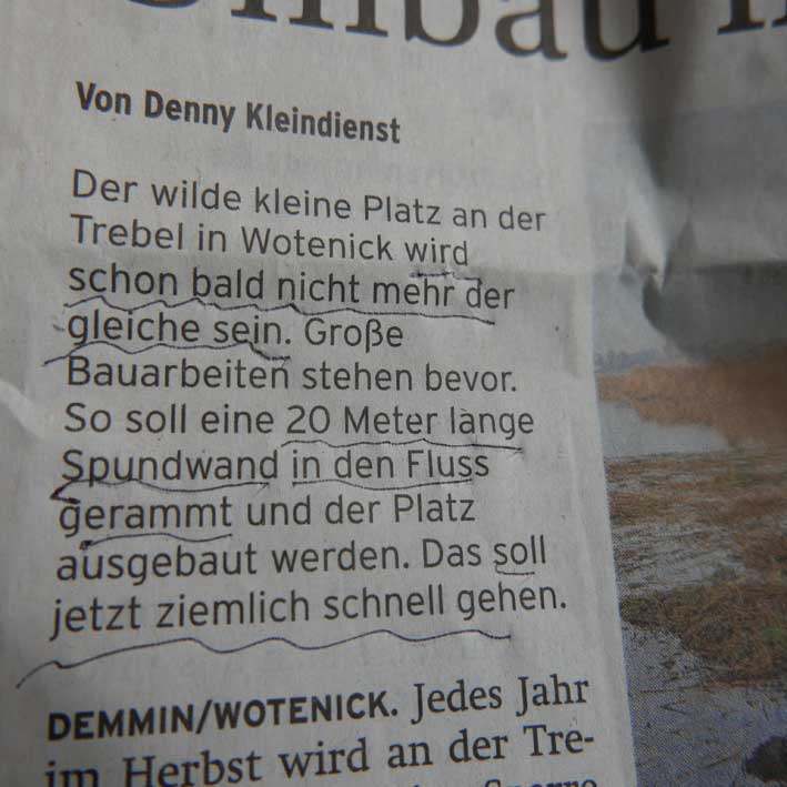 Auch in Wotenick/Demmin hat man die Abgeordneten hinter das Licht geführt, es daure noch, und jetzt ist alles ausgschrieben und der Baubeginn vor der Tür. Ohne Beschluss der Gemeinde, die man ohnehin nicht brauche. In Nossendorf ist das Ufer der Trebel seidem tot, ohne Baden und ohne Uferleben.