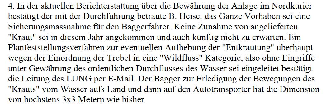 Die sogenannte Entkrautung sammelt nicht das Kraut und entsorgt, damit alles beeser fliesst. Sie schafft das Kraut, zumindest in der Trebel hier, durch Mahd, um dann die Enrtfernung nun mit industriellen Anlagen zu bewirken.