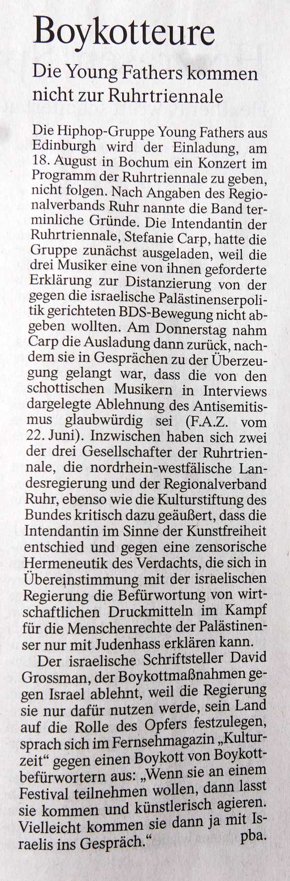 Im Radio zum Jahrestag der Luftbrücke das feierliche Gedenken an die Rede Kennedys im Namen der Freiheit vor den Mauern im Berlin seines "ich bin ein Berliner" Schwurs. Wer ist heute ein Palästinenser, wenn er von Auschwitz spricht, und wo ist die Luftbrücke ins hungernde Gaza über das fette Tel Aviv hinweg. Aus dem sich nun frei feiernden Europa.