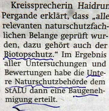 Dem entgegen steht die Auskunft des zum aktuellen und -ernannten-Bürgermeisters in N. dass weder am Erhalt der alten Hecken, noch an Neuanpflanzungen gedacht sei. Hecken zwischen den neu zu pflanzenden Bäumen wären kontraproduktiv, weil sie das Wachstum der Bäume behindern würden. Im übrigen könne die Gemeinde da aber überhaupt nichts machen, da es sich um eine Kreisstraße handelt. Die Straßenmeisterei würde auch die Reste (Wurzeln) der alten Hecken ausfräsen.