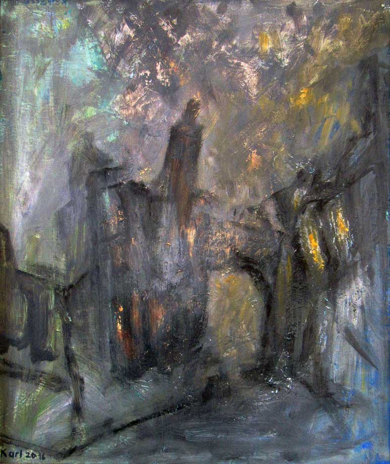 gleichzeitig kann amn im Pavillion des Marienhains auch dises Bild sehen von Karl Schlösser mit seinem grossen Zyklus vom brennenden Demmin 45. Glücklich die Stadt, die soetwas bieten kann. Heute.