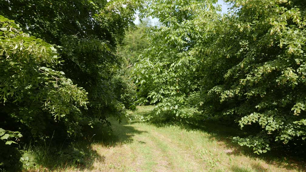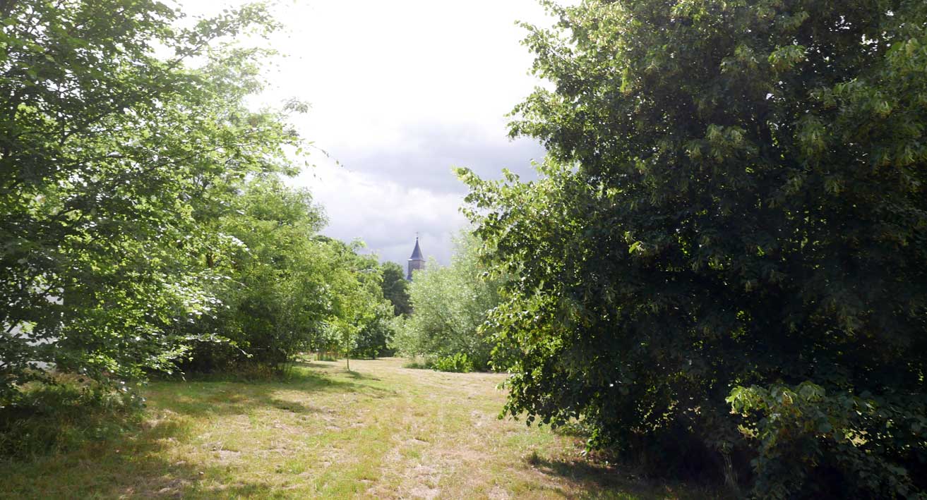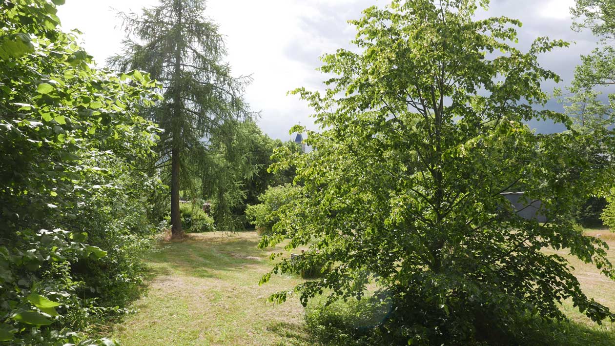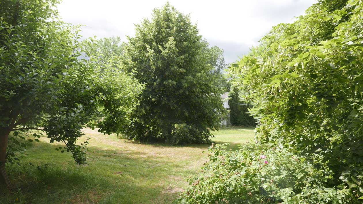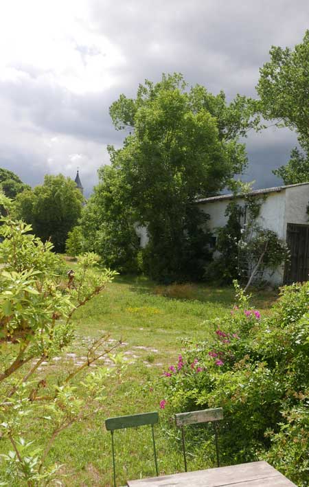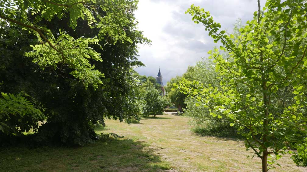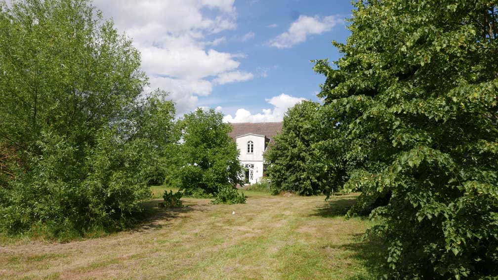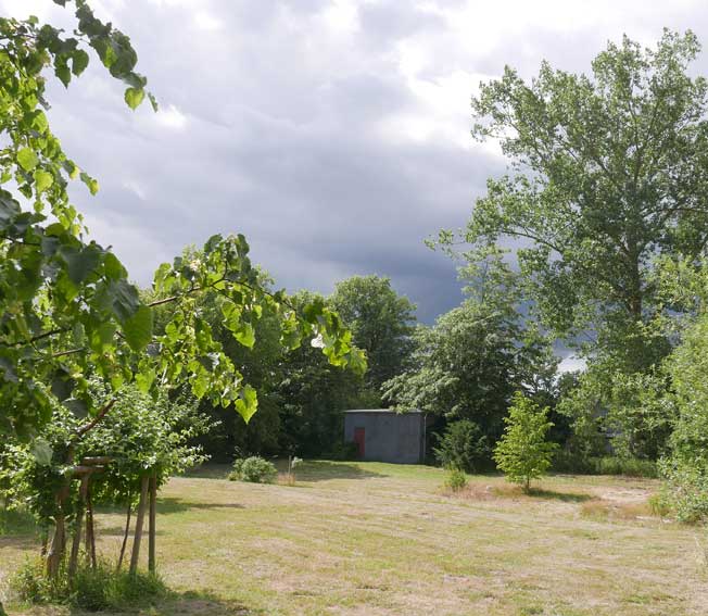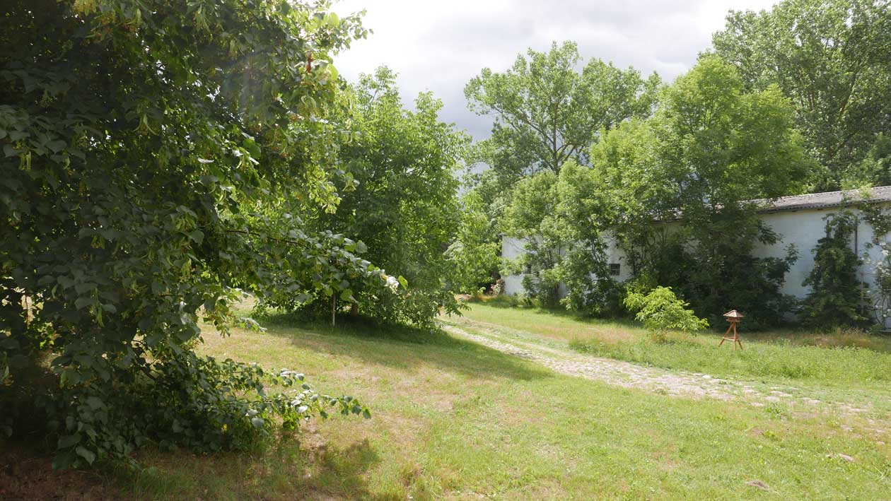 das Bunker genannte Archiv ohne Fenster mit nun ohne Pappel darüber und dahinter, im Februar gefällt, und nachwachsende Linde im neuen Ensemble er Bäume.