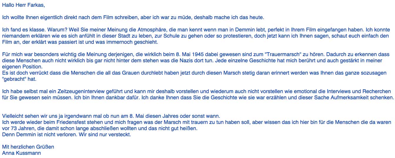 diesen Brief aus der mail-Post an M. Farkas den Reggisseur des Films vorliegend, erlaube ich mir zu beantworten.