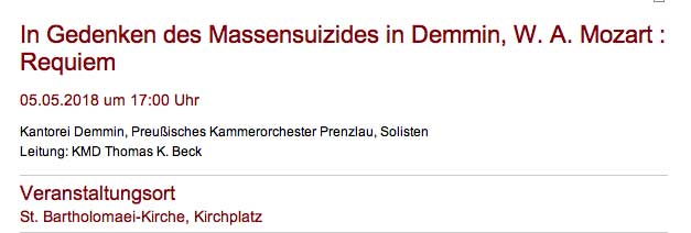 Jetzt aber in disem Jahr wird es eine Totenfeier geben das Requiem von Mozat in der Kirche und gesungen von Stimmen aus Demmin, angekündigt von der Sadt selbst. und zur Nahe des Tages der Toten am 30. April und 1. Mai. offen für alle. Und so gleiche, nebeneinander.