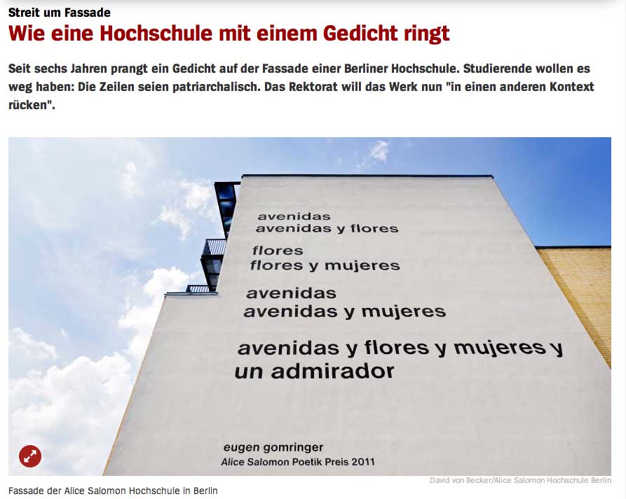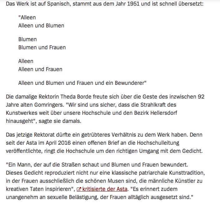 Was genau ist "sexistisch"? An der Berliner Alice-Salomon-Hochschule gibt es seit Wochen Streit über ein angeblich sexistisches Gedicht. Es ziert seit Jahren die Fassade, auf Spanisch, denn es stammt von Eugen Gomringer, einem 92-jährigen, ziemlich bekannten Lyriker, Sohn einer Bolivianerin. Der sexistische Text geht auf Deutsch so: "Alleen / Alleen und Blumen / Blumen / Blumen und Frauen / Alleen / Alleen und Frauen / Alleen und Blumen und Frauen und / ein Bewunderer".