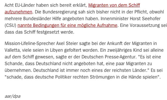 Im Radio, dass verschiedene Länder Europas sich bereit erkläten Flüchtlinge des Schiffs aufzunehmen. Und: Deutschland ist nicht dabei. Verboten vom derzeitigen Innenminister.