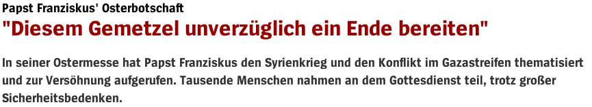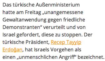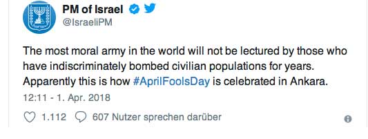 Netanyahu sagte am Sonntag zu Erdogans Attacken: "Die moralischste Armee der Welt wird sich keine Moralpredigten anhören von jemandem, der selbst seit Jahren eine Zivilbevölkerung ohne Unterscheidung bombardiert." Erdogans Äußerungen müssten wohl als Aprilscherz gedacht sein, schrieb er bei Twitter