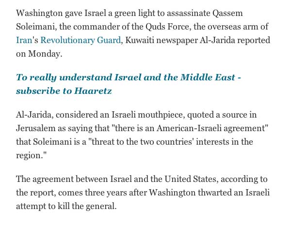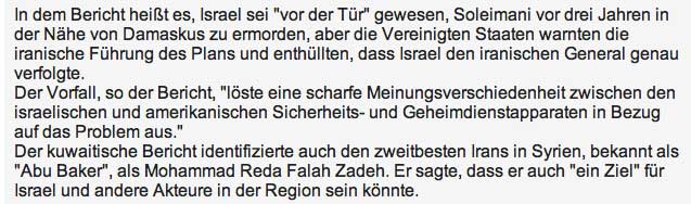 due USA genehmigen Israel die Ermordung des Generals der Iranischen Garden. Man stelle sich vor Russland verhandle offen über den Abschuss eines ihr nicht genehmen Generals über die Grenzen im anderen Land.