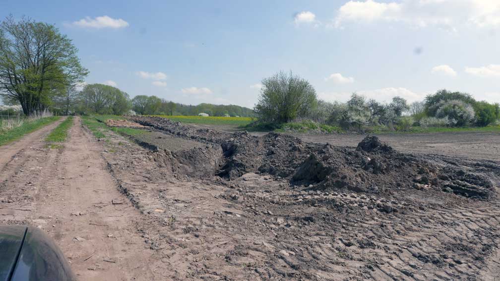 Warum die Eichen aber an der Strasse nach Volksdorf nun gefällt wurden, wenn Pappeln krank waren, noch nach dem Massacker, werden sie noch beweisen müssen und gefällt vom selben Besitzer der Felder wie am Heuweg in Medrow oben, das auch.