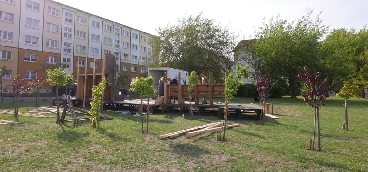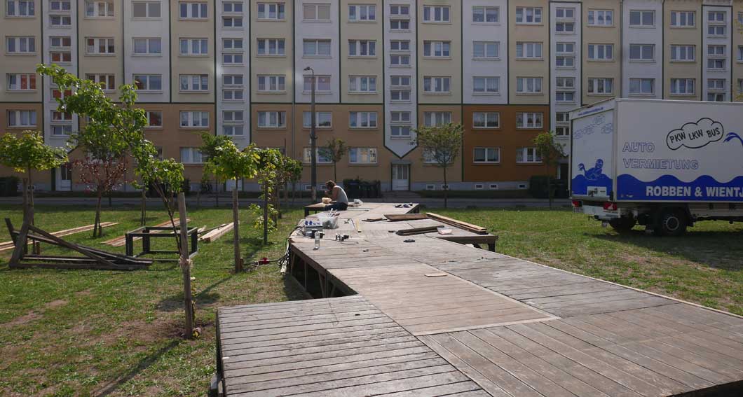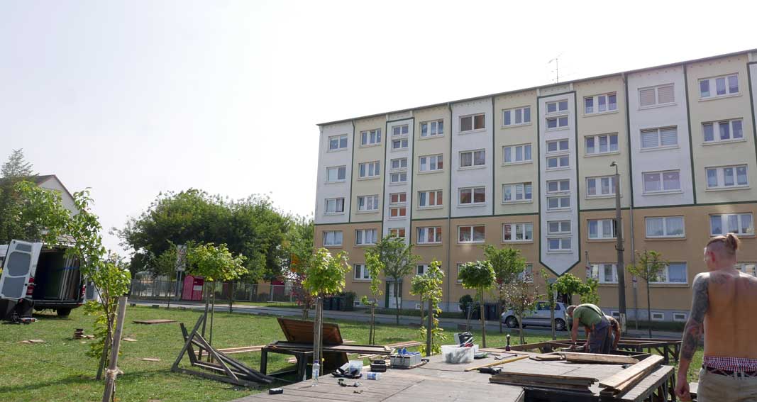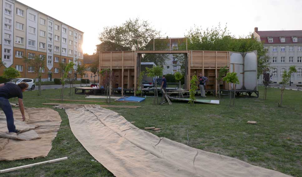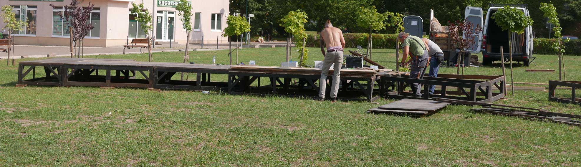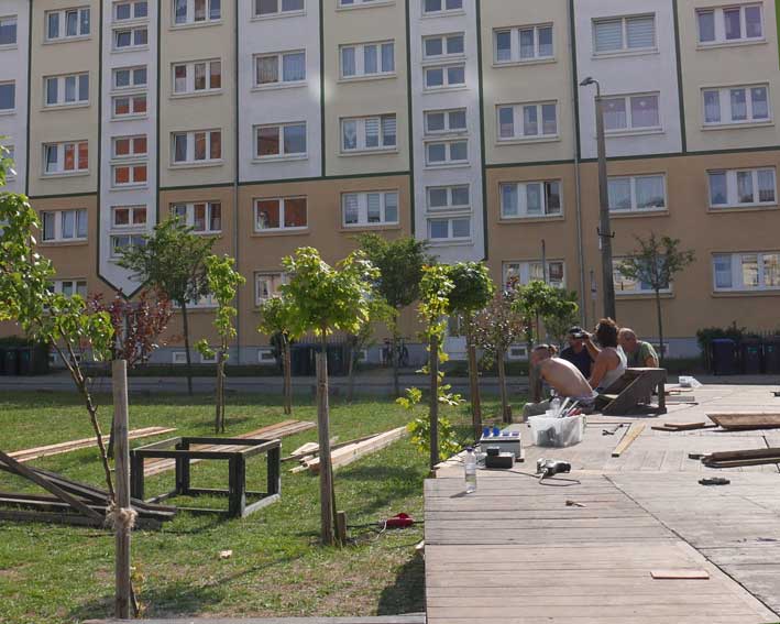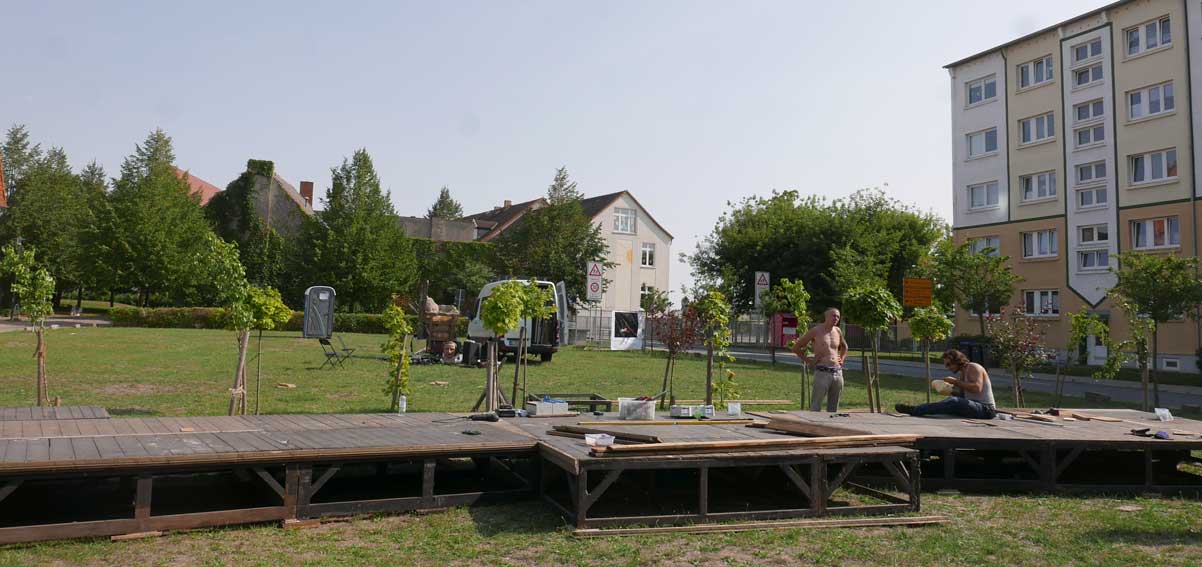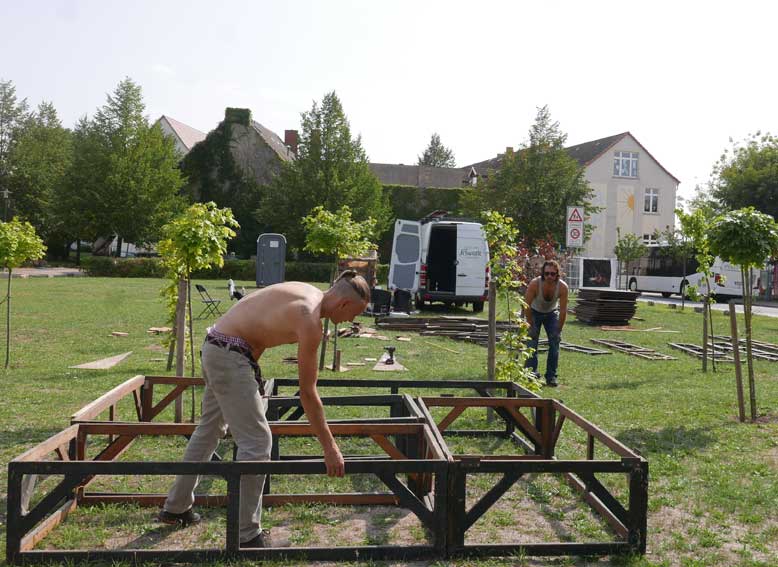 eben noch die Bäume dort gepflanzt, dass da was ist in die Leere, und die Menschen die alten Wege wieder wissen, quer durch ud über die Tioten. Jetzt im Wege, der Weg? Nein, einbauen. Das Neue wagen.