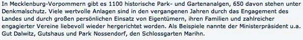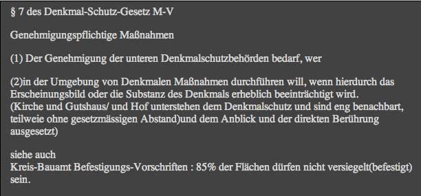 "Die Recherchen ergaben, dass der zum denkmalgeschützten Gutshaus gehörende Park nicht als Boden- oder Flächendenkmal ausgewiesen ist. Auch hierdurch würde kein Hinderungsgrund zur Erfüllung der Forderung [Beseitigung der Bäume Anm. MGe] bestehen."