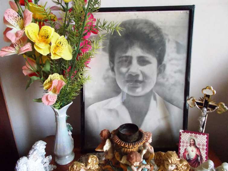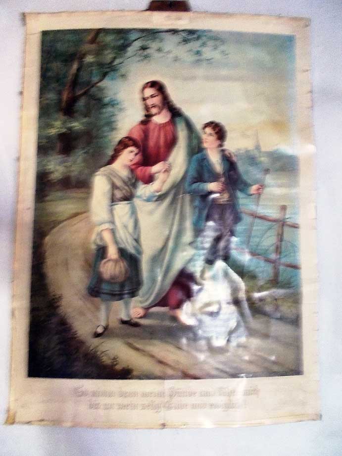 "eider ist das Foto recht unscharf. Der Text: "So nimm denn meine Hände und führe mich bis an mein seligs Ende und ewiglich." Der armenische Junge hat es in Ribnitz-Damgarten vom Sperrmüllhaufen mitgenommen ins Asylheim und später in den drei Stunden, die blieben nach Bekanntgabe der Abschiebung, eingepackt. (Seine Worte: "Ich als Armenier und Christ kann sowas nicht liegen lassen.") Nun hängt es in seinem Heimatdorf Landjazat bei Jerewan - im gleichen Zimmer mit der Gedenkecke für seinen großen Bruder Wartan, der 1994 dreizehnjährig beim Fund einer Mine ums Leben kam."