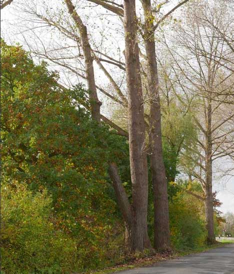 Wir schlugen Weiden vor wie sie historisch vor den vor den Pappeln dort standen und weil günstig in der Anlage und verträglich mit den Sträuchern, Klima-tauglich im gemeinsamen Habitat von Feld und Tier., so wie sie jetzt schon am Rande stehen.