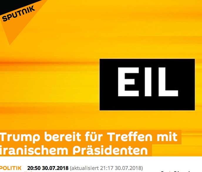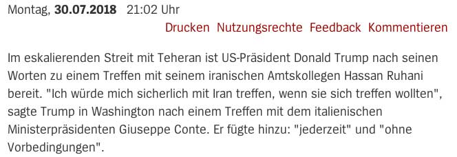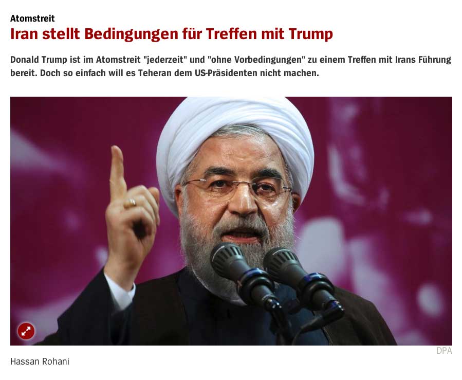 Iran stellt Bedingungen für ein Treffen mit Donald Trump. Der US-Präsident müsste seinen Ausstieg aus dem Atomabkommen rückgängig machen und die neuen Sanktionen gegen Teheran au§er Kraft setzen. Das teilte der Berater des iranischen Präsidenten Hassan Rohani, Hamid Abutalebi, mit. "Zurück zum Atomdeal, Ende der Feindseligkeiten und Respekt fürs iranische Volk (...) und dann kšnnte man den Weg ebnen, um aus dem jetzigen Dilemma herauszukommen", schrieb Abutalebi auf seiner Twitter-Seite.