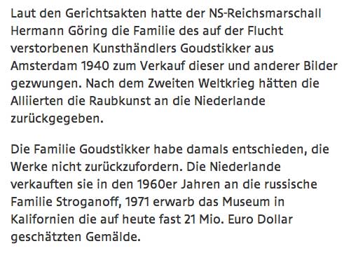Die Wahrheit -siehe oben- nämlich enthält die Frage: woher hatte G. die Bilder. Und von dem eigentlichen Besitzer aus St. Petersburg hatte das Museum in Pasadena die Bilder, die dort nun weiter ungefährdet öffentlich hängen. Gottlob in den USA.