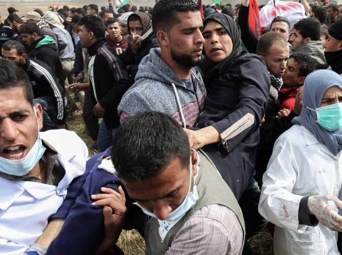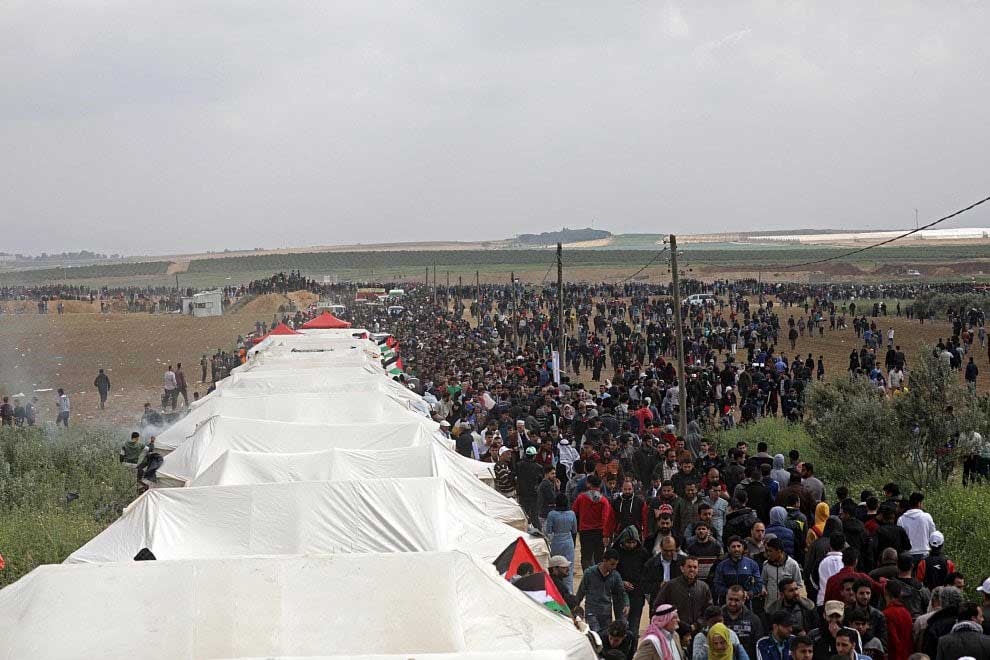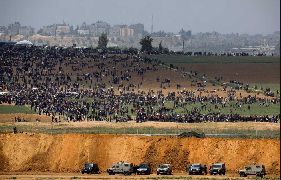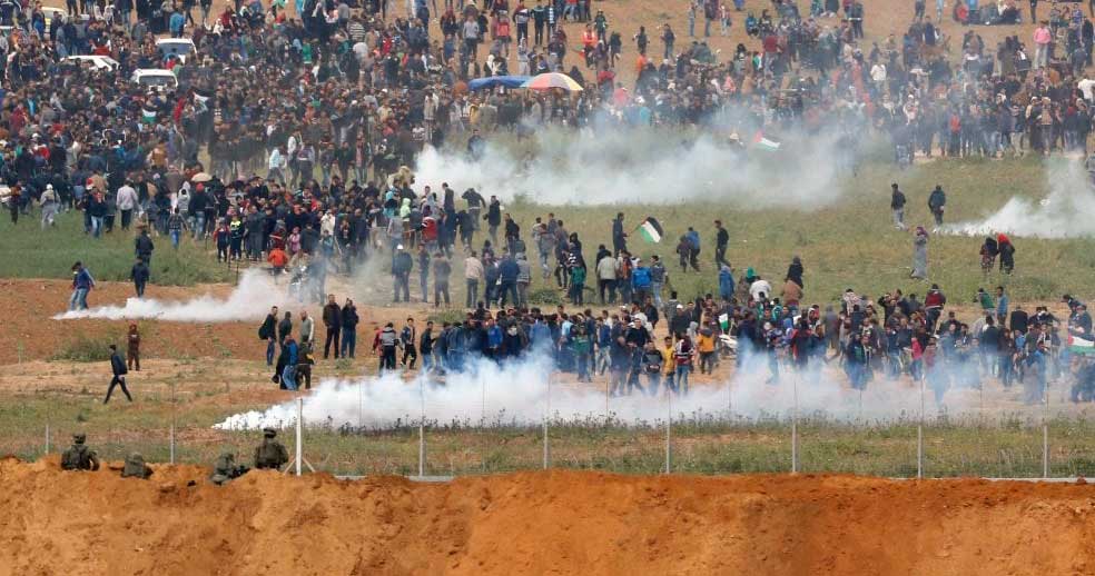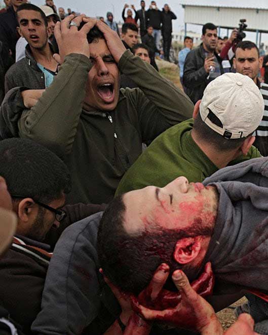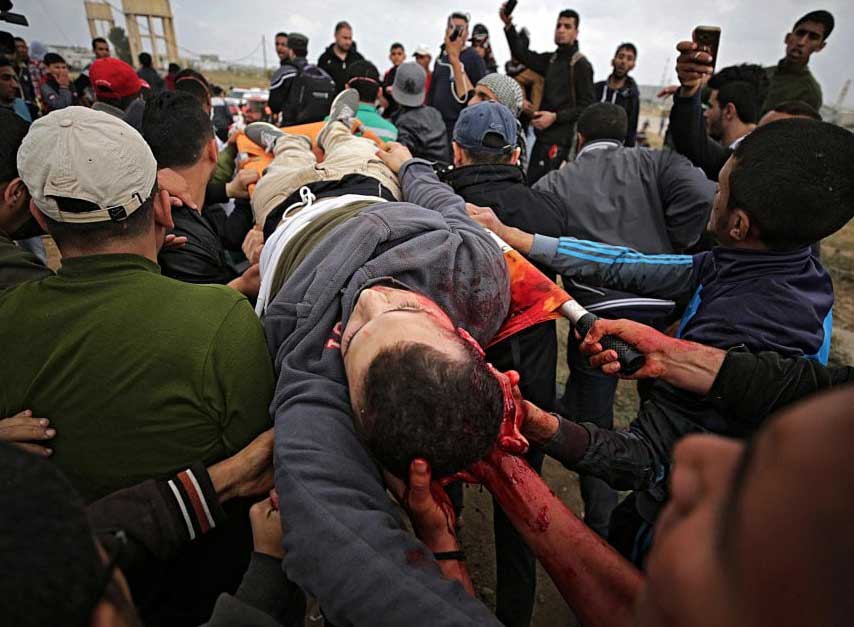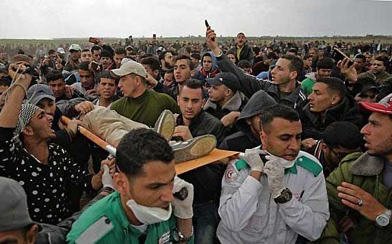 Nachdem sich einzelne Palästinenser der Sperranlage näherten, Reifen in Brand setzten und Steine warfen, eröffneten israelische Sicherheitskräfte das Feuer mit scharfer Munition. Bis zum Nachmittag wurden dabei mindestens sieben palästinensische Männer getötet; am Abend wurde die Zahl nach oben korrigiert - es wurde bekannt, dass mindestens 16 Menschen getötet wurden. Das jüngste Todesopfer war 16 Jahre alt. Das palästinensische Gesundheitsministerium teilte am Abend mit, rund 1100 Menschen seien verletzt worden.