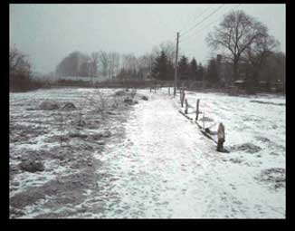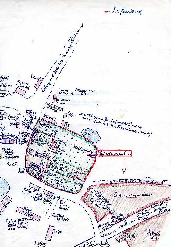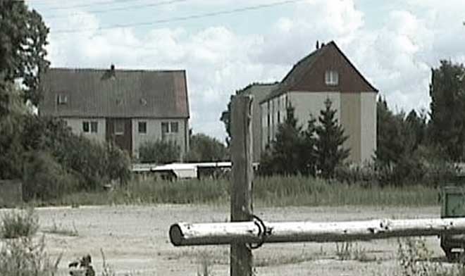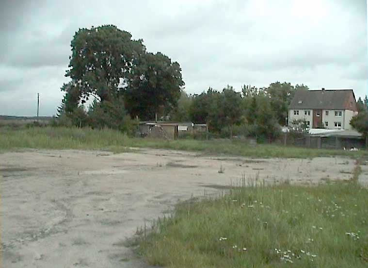 zur Zeit der Wende sah das noch so aus als sozialistische Errungenschaft des Dorfs : die umgewandelte Koppel mit Park in eine betonierte Industrieanlage der LPG un d angehängtem Neubau im Plattenbau-Stil plus Schule (rechts). Der ehemalige Graben unter der Erde als Rohr mitten hindurch das nun erhalten werden soll. Mit vor Gericht gestelltem Baum-Opfer.