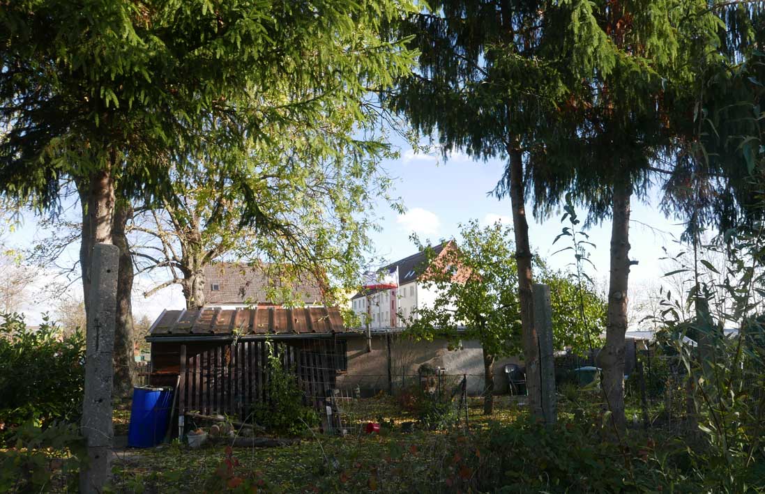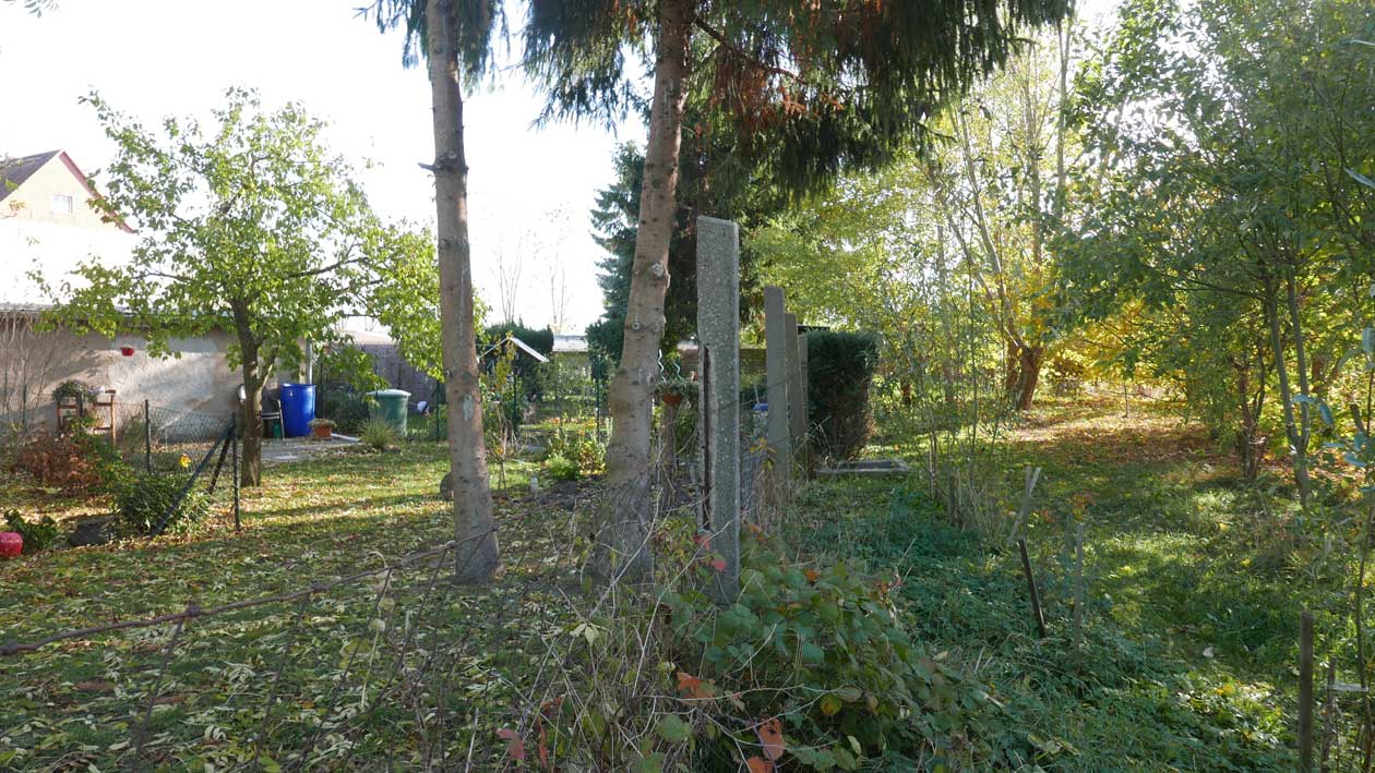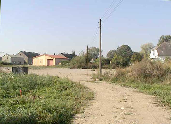 < wo bis 1945 der Graben verlief mit Brücke hinüber und Hecken und Bäume vor den Garagen jetzt und Neubauten im Plattenbaustil.