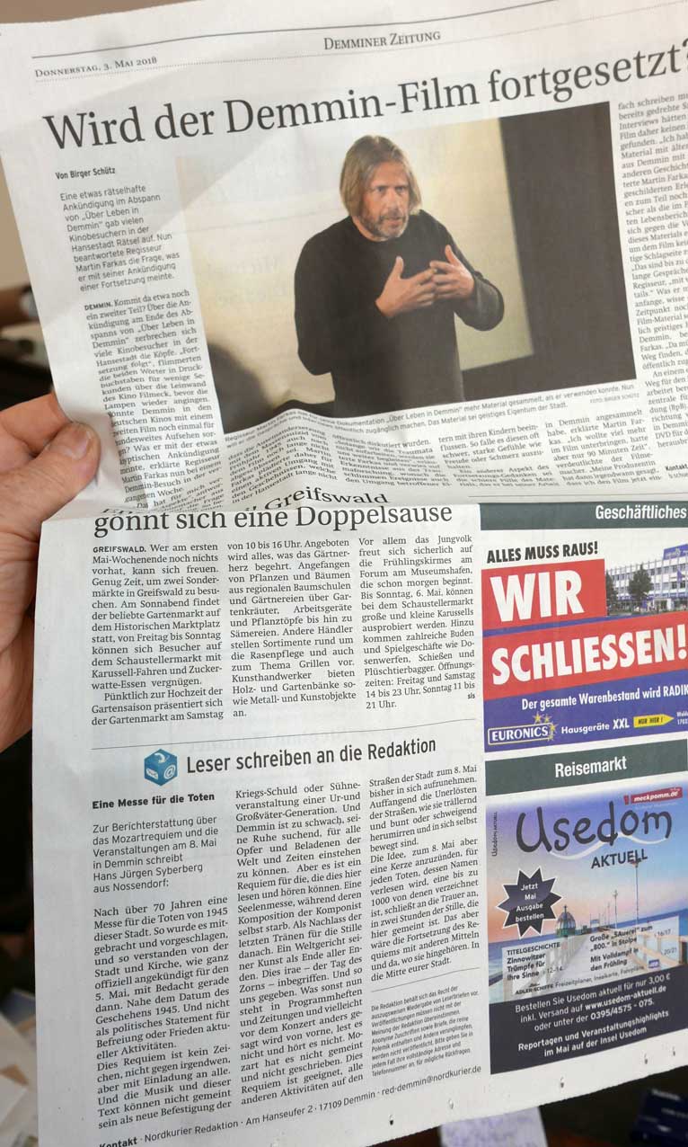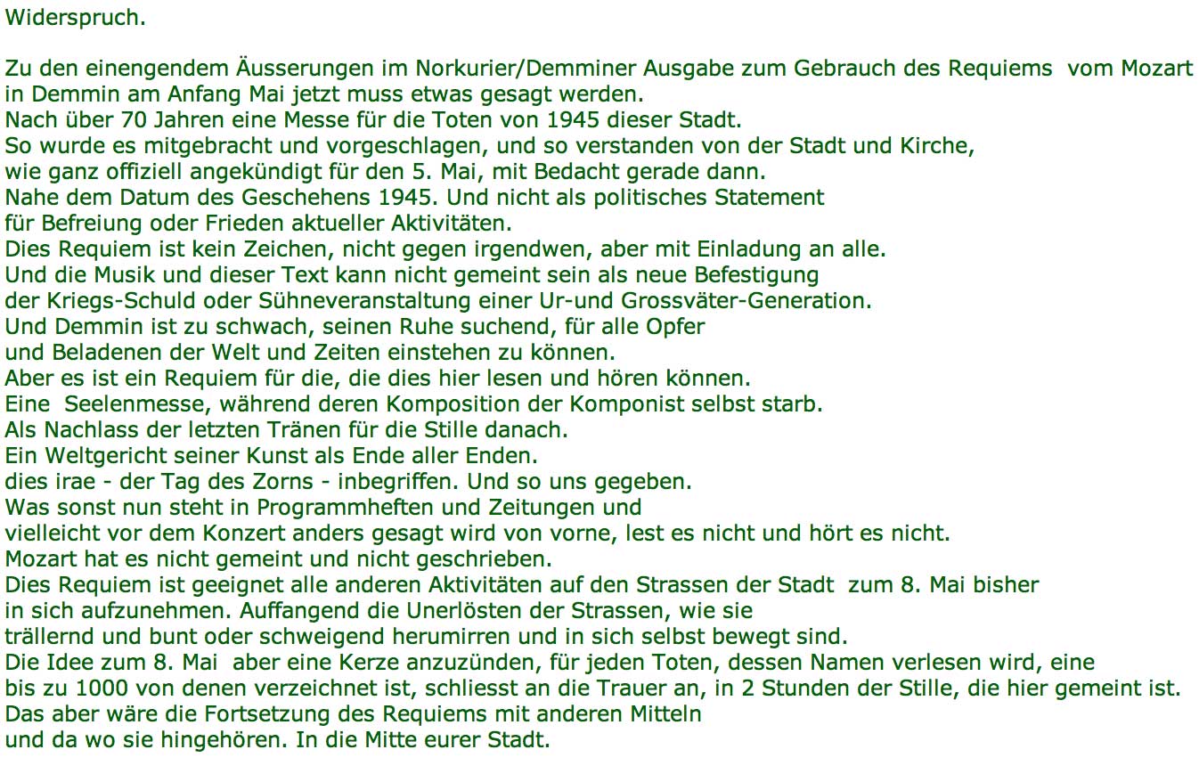 Aber mit den schon vorhandenen Materialien wie Demmin ein Anderes wird. Und schon daran arbeitet. Mit den Hilfen aus Schwerin und Berlin vielleicht. Nur so geht es . Und das fing am Markt an 2015, alles da aufgenommen, wie es anfing aus der Idee, und was das hiess für alle in Demmin seitdem, ging dort weiter 2016 mit den Bäumen auf den Ruinen im Detail, und dann 2017(Cafe Zilm) und wie es jetzt mündet in die Messe für die Toten der Stadt, die verschiegenen, bis heute in ein Trubel falscher Gänge und desLärmens versteckt.