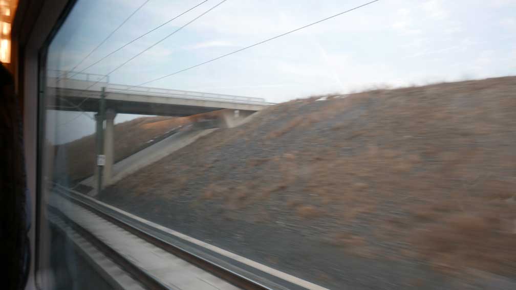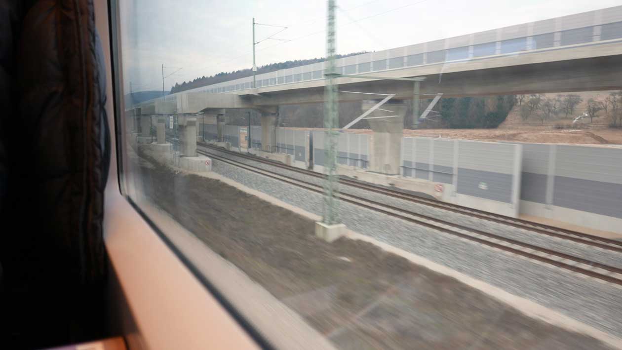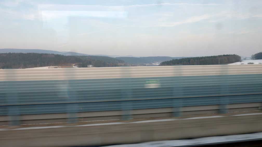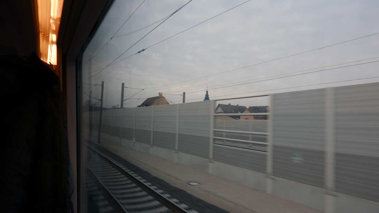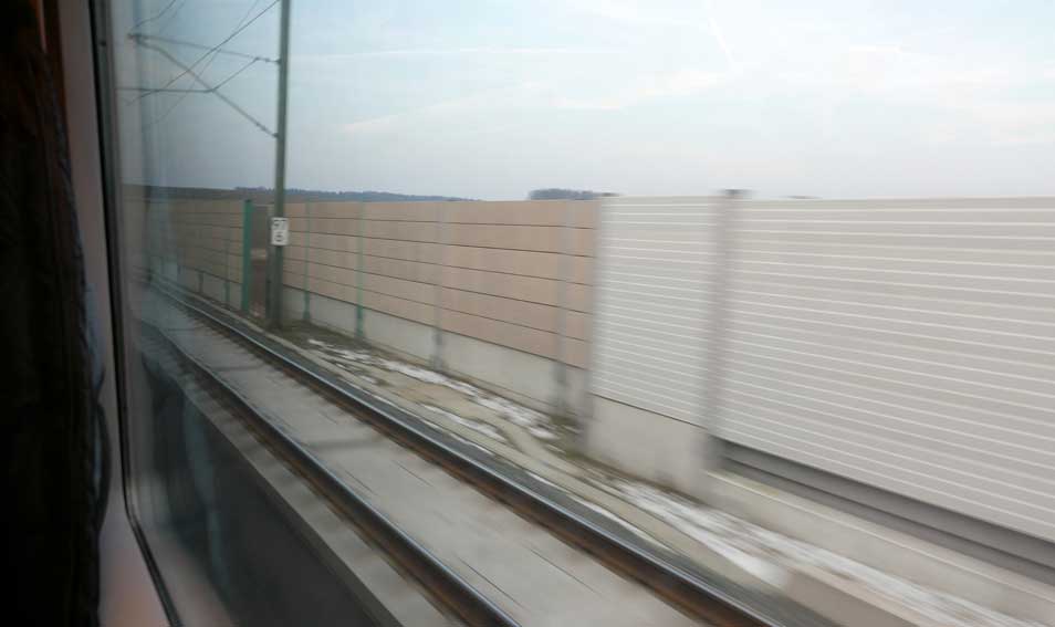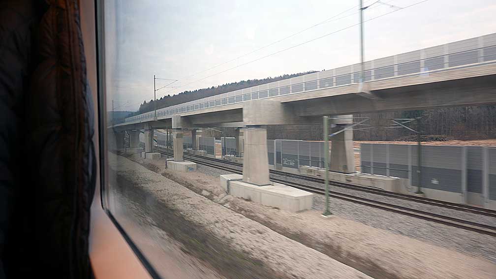 ab Banberg sehen wir die neue DB Strecke durch ein Land ohne Landschaft und Dörfer oder Städte fahren und Kirchtürmem hinter Haushohen Mauern versteckt.