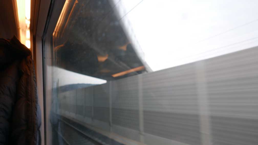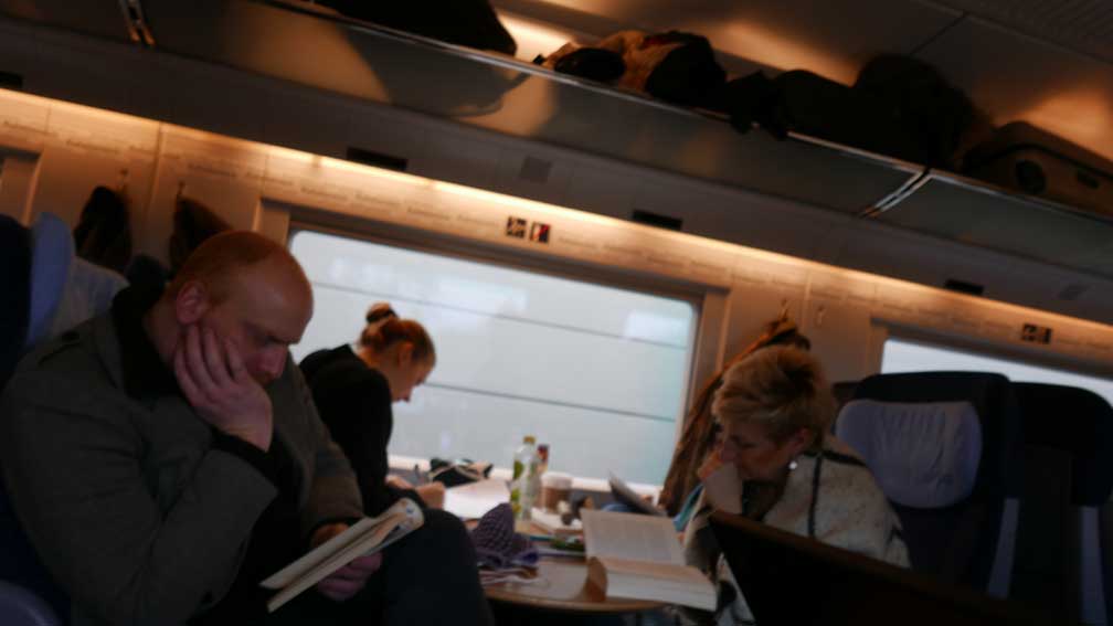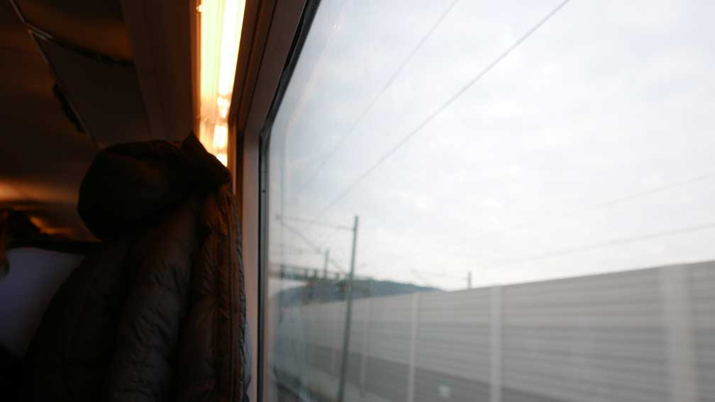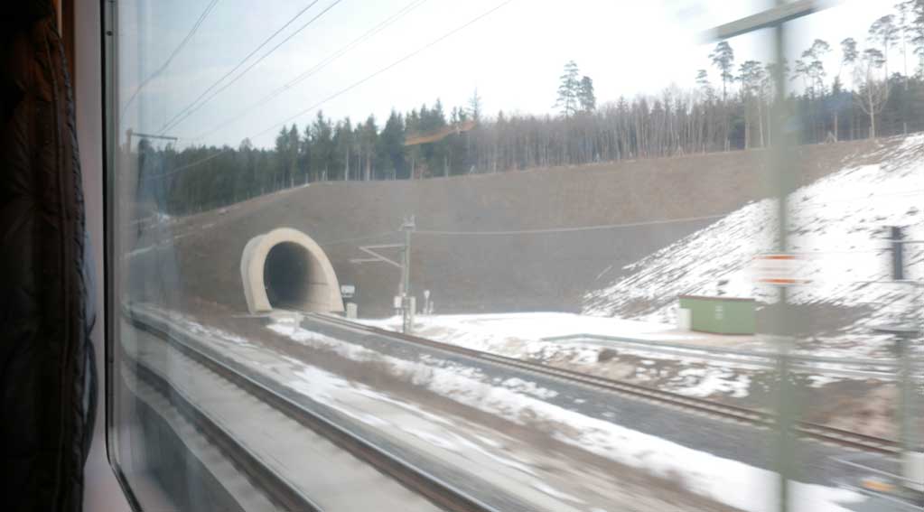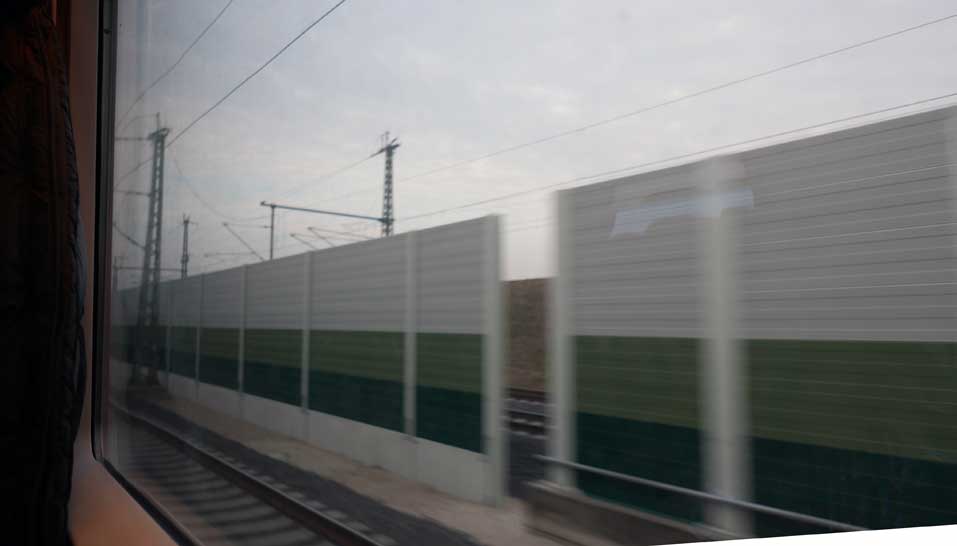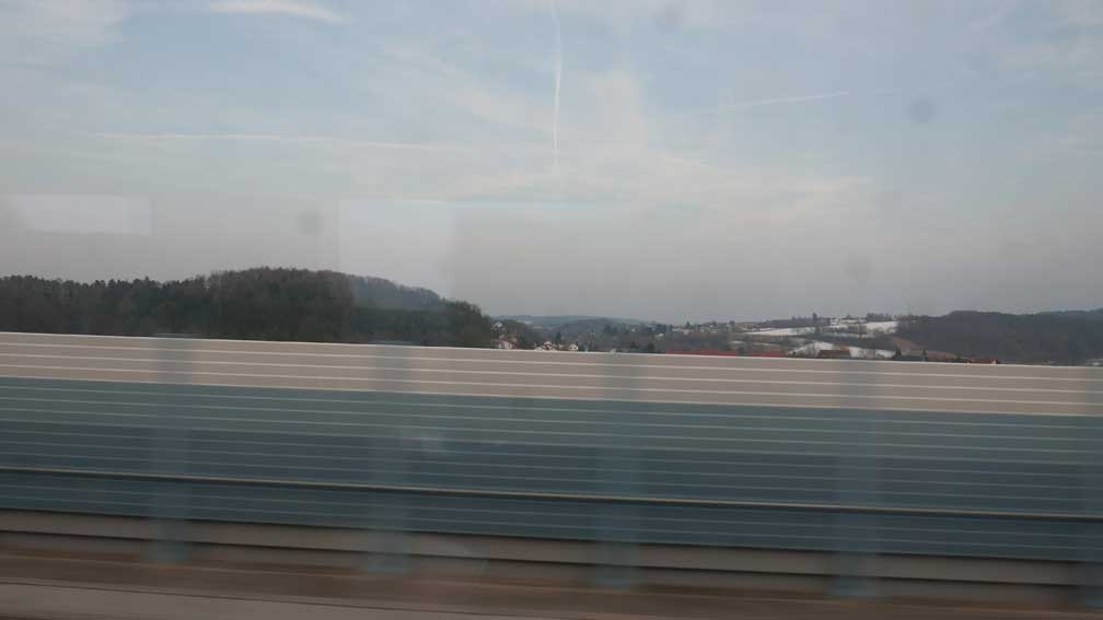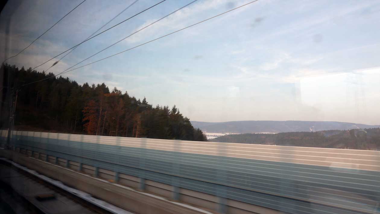 ab Banberg sehen wir die neue DB Strecke durch ein Land ohne Landschaft und Dörfer oder Städte fahren und Kirchtürmem hinter Haushohen Mauern versteckt.