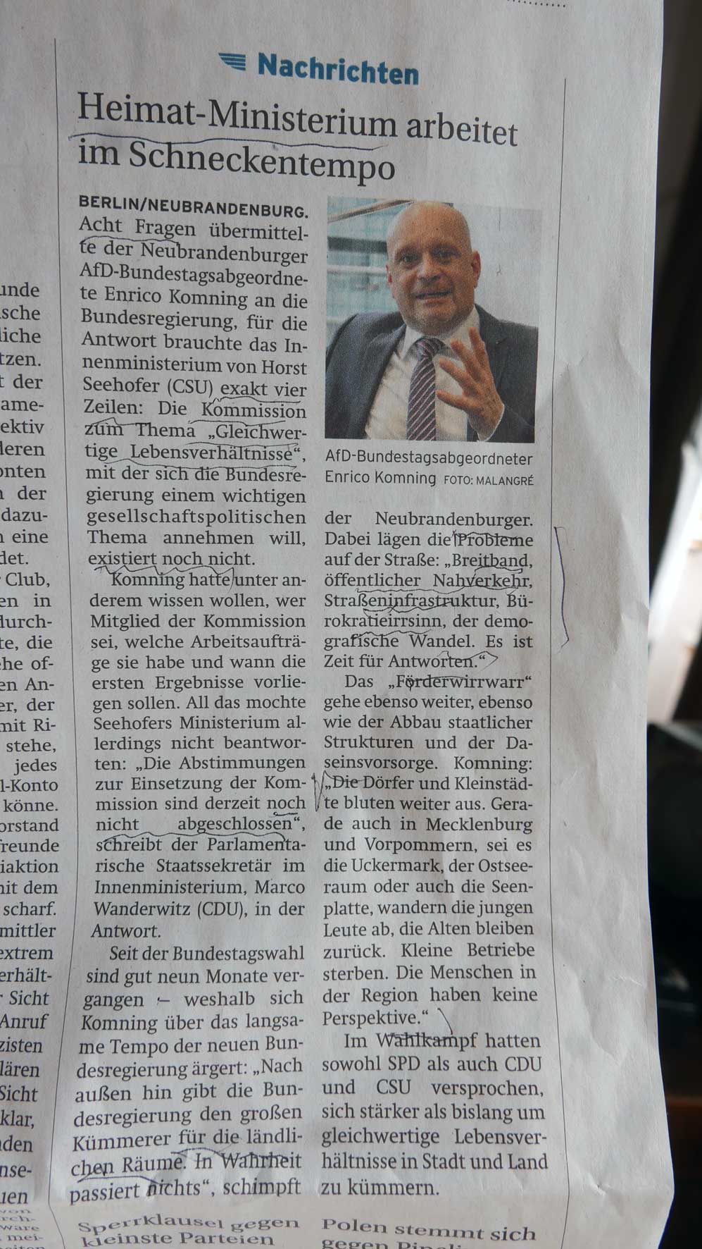 Anlässlich der neuen Formation der Regierungsvereinbarungen, versuchten wir für Demmin Interessen bei dem neuen Minister für atuelle Heimat-Fragen zu wecken. Gerade für Demmin und wir. Er hatte erklärt, dass nicht Lederhosen sein Thema sei. Alle Zeitungen waren gespannt. Zwei Briefe persönlich und sofort, ohne Antwort auch nur des Empfangs von der Sekretärin, 2 Briefe an die Staatssekretäre ohne Antwort. Erinnerungsmails, Telefonversuche. Nichts.