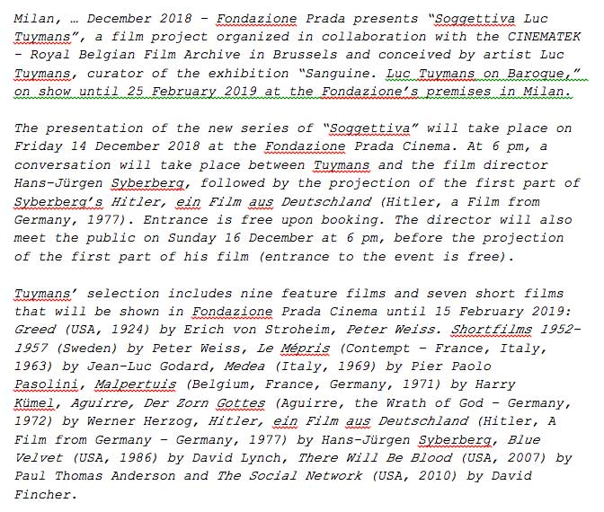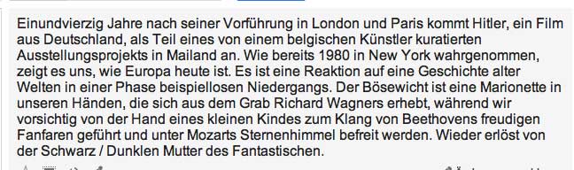 Dieser Hitler als Film aus Deutschland, 41 Jahre nach seinem 1.Erscheinen in London und Paris und nun in Mailand mit einer Einladung zu einem belgischen Kunst-Parcour, zeigt uns, was Europa noch ist, durchaus erkannt in New York seit 1980. Eine Antwort auf seine Geschichte noch im Untergang dieser alten Welten ohne Gleichem. Der Exekutor als Puppe in unserer Hand, dem Grab Richard Wagner entsteigend, wir vorsichtig geführt von eines Kindes Hand, mitten hindurch in die Fanfaren der Freiheit zum Jubel Beethovens und unter Mozarts Sternenhimmel befreit. In dieser schwarzen Mutter der Phantasien erlöst - noch einmal.