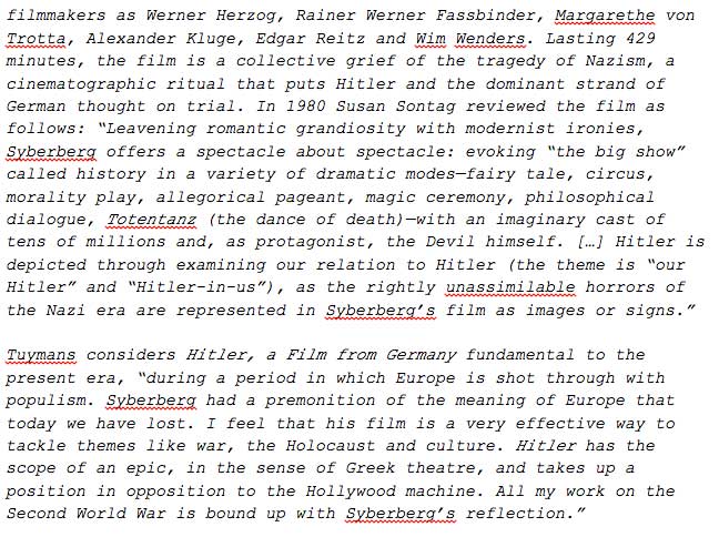 "Ich habe den Film gesehen, als es 1978 herauskam, und finde ihn sehr wichtig für unsere Zeit in einer Zeit, in der Europa vom Populismus überflutet wird. Syberberg hatte eine Vorahnung über die Bedeutung Europas, die wir verloren haben. Ich finde einen sehr wichtigen Weg, um über Krieg und Holocaust und auch über Kultur zu sprechen. Der Film wurde in Studios gedreht und wirkt wie ein epischer Film im Sinne des griechischen Theaters und ist gegen die Hollywood-Maschine gerichtet. Hitler verkörpert die beiden vorherigen Filme der Trilogie, ist aber der wichtigste. Alle meine Arbeiten zu dieser Zeit, zur Nachkriegszeit, hängen mit seiner Reflexion zusammen. "