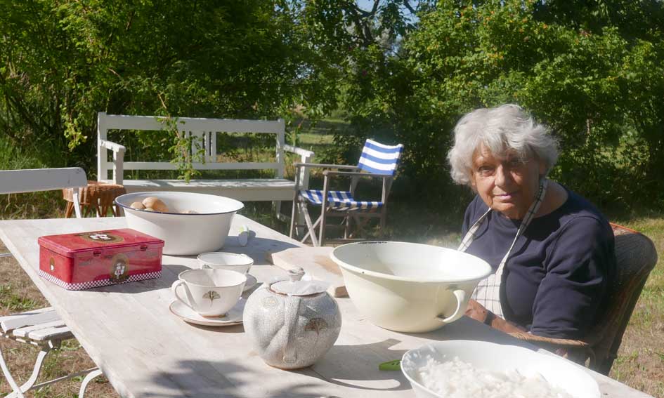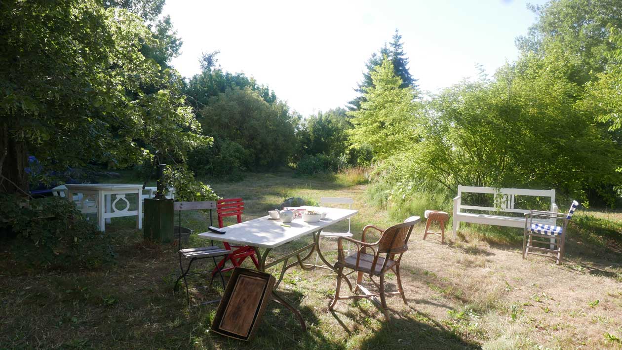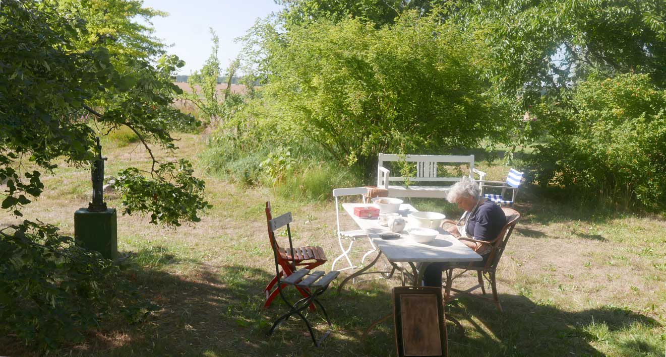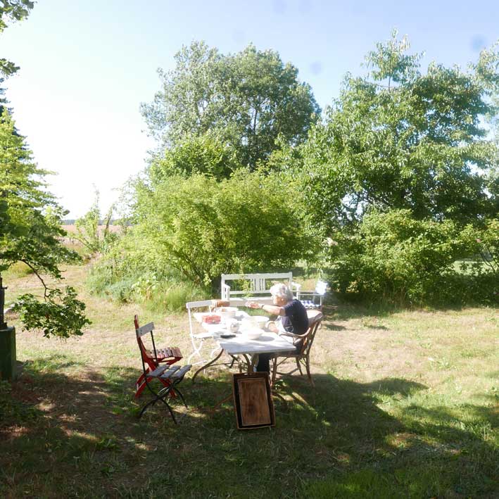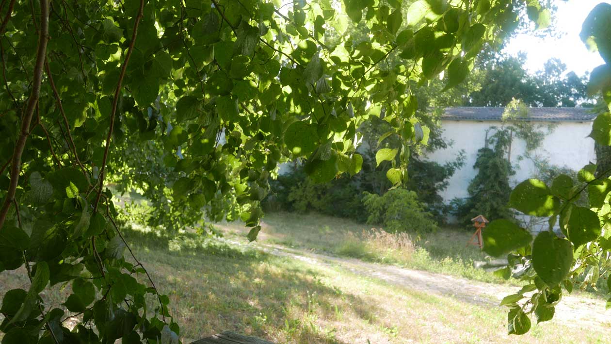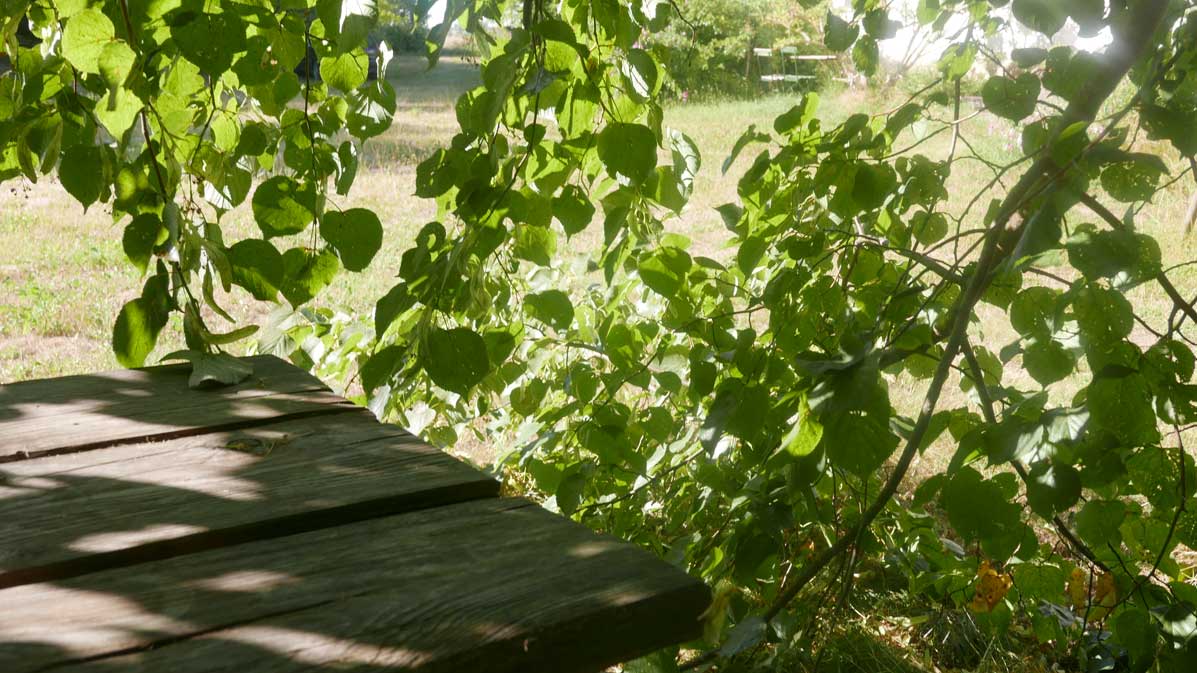 Die Linde vor dem Haus, tief herabgewachsen mit Bank und Tisch nun wieder zum Emfang