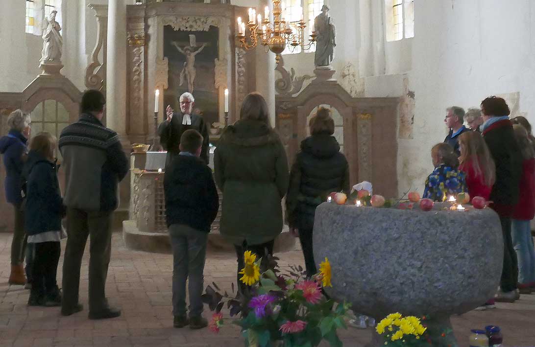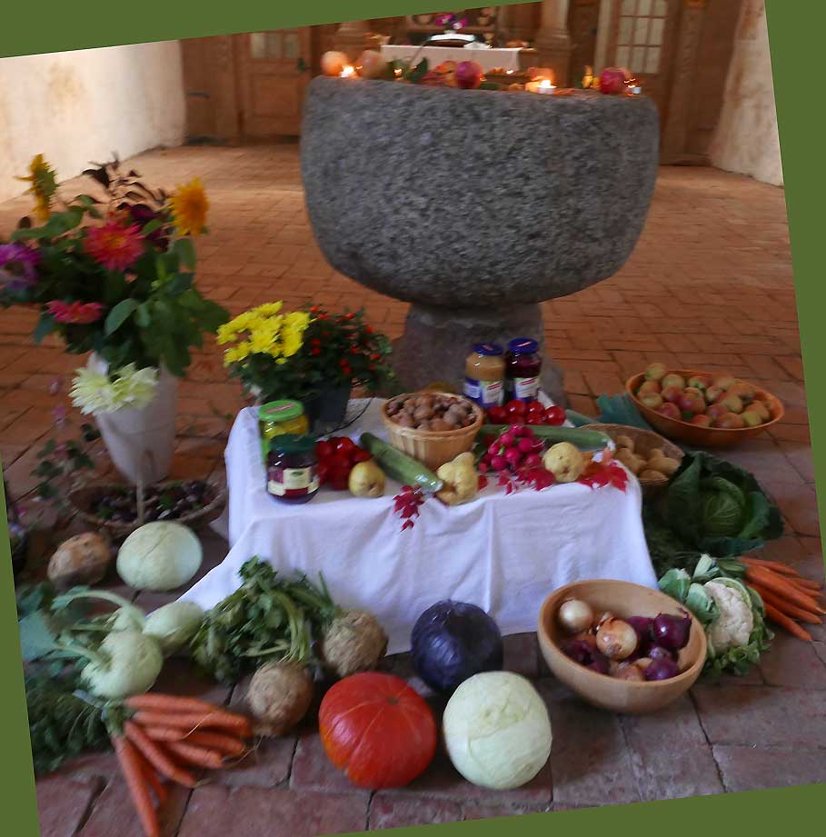 Erntedankfest gibt uns Gelegenheit über unsre Nahrung nachzudenken und uns für alles, was die Natur uns beschert Gott zu danken : für alles was wächst und gedeiht und uns ernährt. Gedankenlos gehen wir in den Supermarkt und kaufen meist ferige Gerichte, ohne nachzufragen, woraus die bestehen oder uns dafür zu interessieren, wie sie hergestellt werden.Z.Beispiel Bei einem Preis von € 0,99 für 1 Pfund Hackfleisch oder € 0, 65 für eine Dose Hundefutter könnte man sich fragen, unter welchen Unmständen die Tiere, auch Lebewesen, gehalten werden, die so billige Produkte möglich machen. Billigfleisch wie klein gehäckselt und in die Wurst getan, die dann mit einem lachenden Gesicht versehen meine Enkel so gerne essen. Wie werden Pflanzen, bzw. Gemüse und Obst angebaut, die zu diesen Billigfertigprodukten verarbeitet werden. Wir bekommen von der Lebensmittelindustrie diktiert, was wir zu essen haben. Der Kühlschrank in unserer Küche ist wie der Futterspender im Käfig von Kanarienvogel Hansi, der seine Nahrung daraus holt. Nur mehr selten werden in den Familien gemeinsame, selbst gekochte Mahlzeiten eingenommen. Bewundernswerterweise gibt es noch alte alleinstehende Menschen, die auch für sich allein kochen, schön den Tisch decken, vielleicht auch eine Kerze anzünden und sich an den gekochten Speise erfreuen und dafür dankbar sind. Früher hat man auch noch Tischgebete gesprochen, um sich für die dargebotenen Speisen und Getränke zu bedanken.