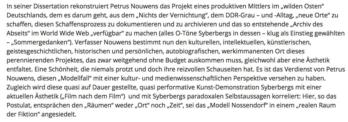 als mir der Postbote heute das Päckchen aus Nossendorf mitgebracht hat, habe ich noch nicht geahnt, was für eine Überraschung auf mich wartet. Sie haben mir ein grosses Gefallen getan und dafür bedanke ich mich recht herzlich. Es ist mir diesmal aufgefallen, wie der Film über die “Höhle der Erinnerung”, als ein Dokument über ein anderes Werk entstanden, zugleich seinen eigenen Weg nimmt und etwas anderes wird, mehr als ein bloßes Dokument. Das Verhältnis zwischen “hier” und “da”, der Innenwelt der Installation und der Außenwelt, das durch rhythmische Bewegung von einer zur anderen Station sich zeigt, macht den Film sehr “musikalisch”, obwohl nicht im konventionellen Sinne einer klingenden Musik (die es ja auch gibt). Die Installation selbst musste für die Besucher wie eine Art Arche wirken, in der die Sprache, Musik und Bild als solche sich versammelt haben, um dort zu “überwintern”. Würden wir sie überhaupt noch merken, gäbe es solche “Archen” nicht? Auch “Café Zilm”, die zu dieser Zeit letztes Jahr stattfand, was so eine “Arche”.