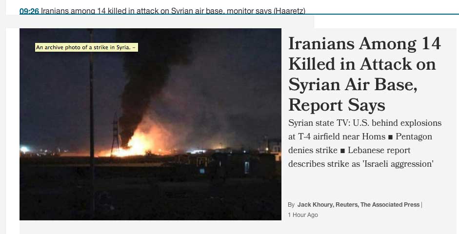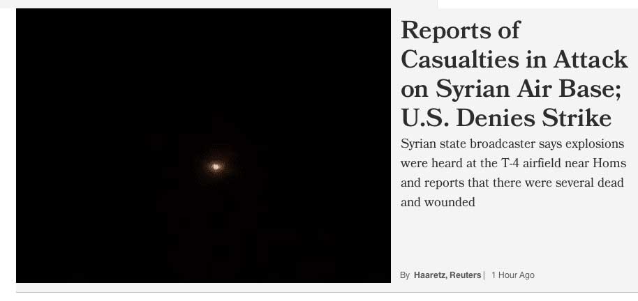 The state broadcaster earlier said explosions were heard at the T-4 airfield near Homs, which is close to the ancient city of Palmyra in central Syria. They reported that there were several dead and wounded.