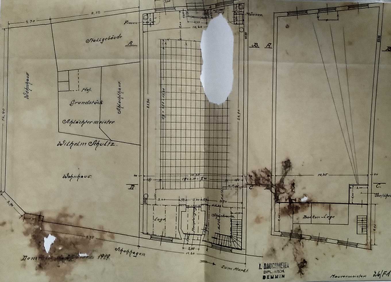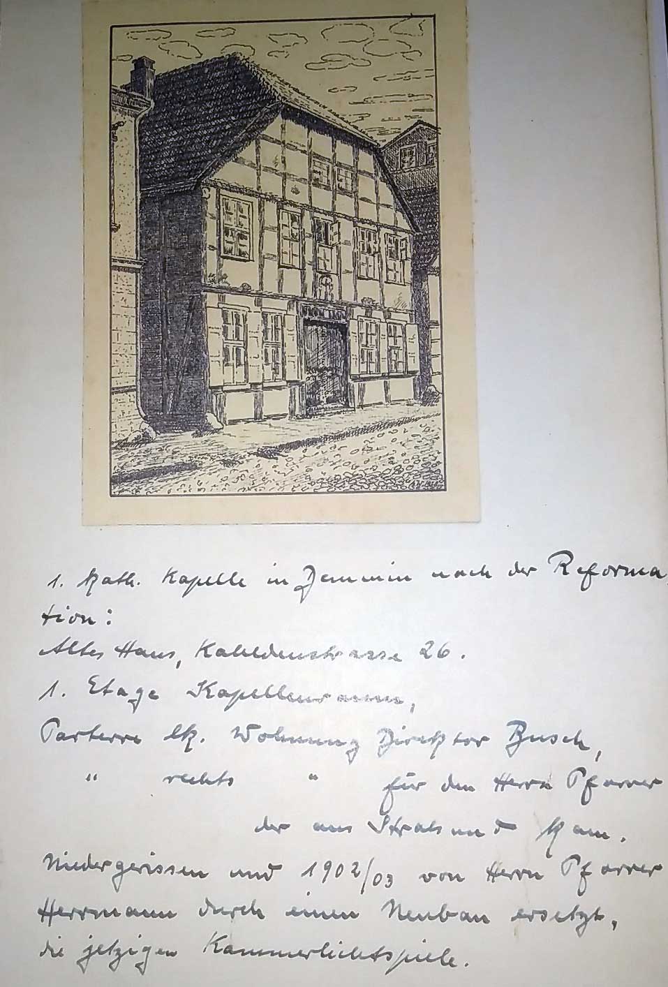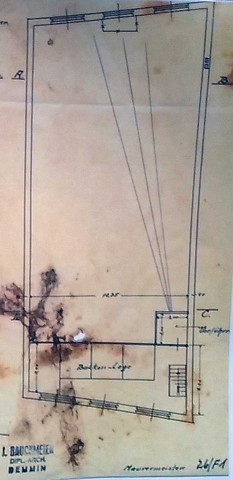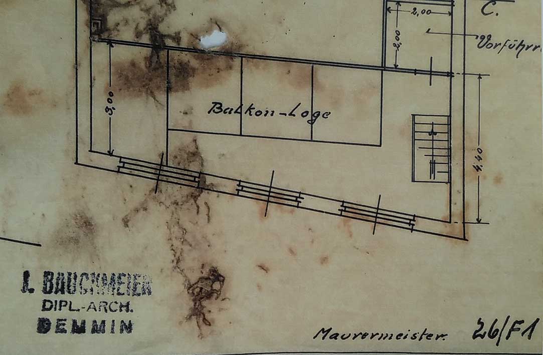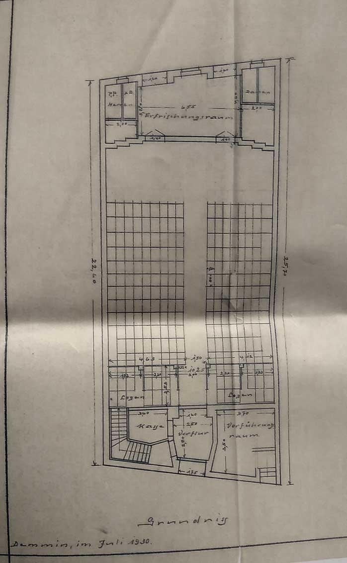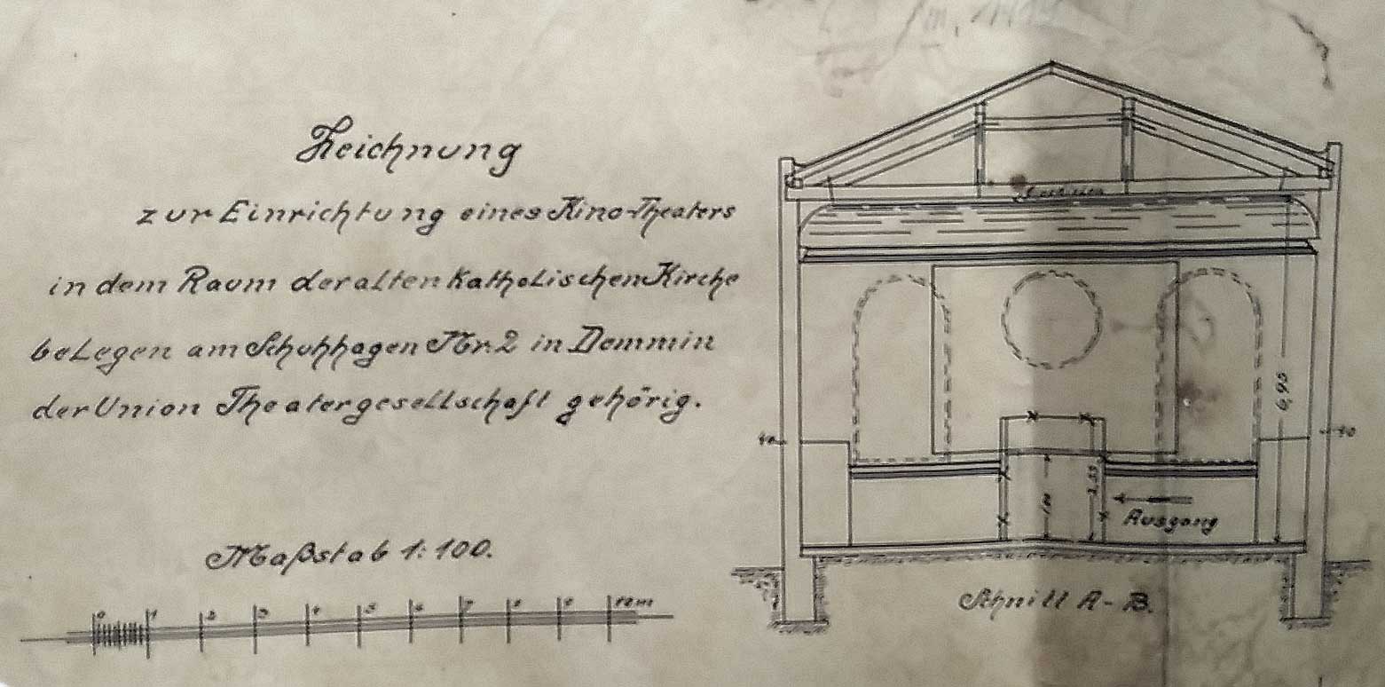 und dann die Unterlagen aus dem Architekturbüro Bauckmeier zur Zeit als die Kirche zum Kino umgebaut wurde(1919). Nach der Erbauung der neuen und grossen kath kirche durch Baucjmeier, und deren Einweihung 1915 in Demmin.