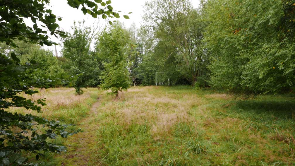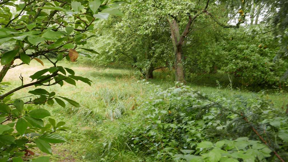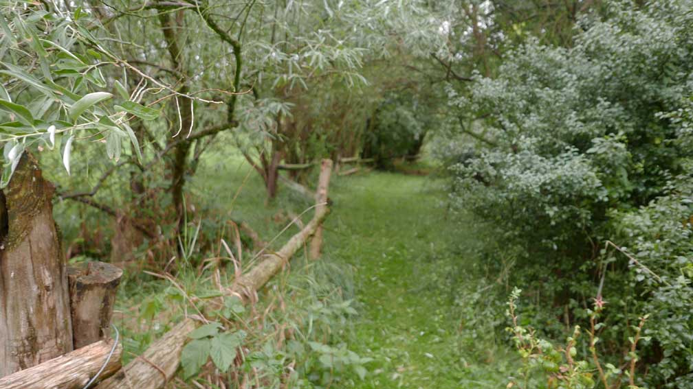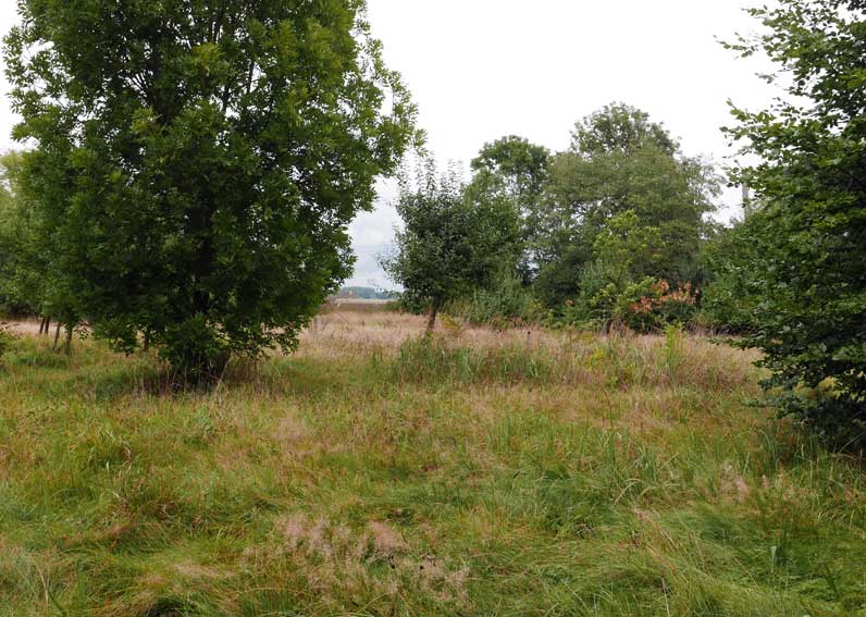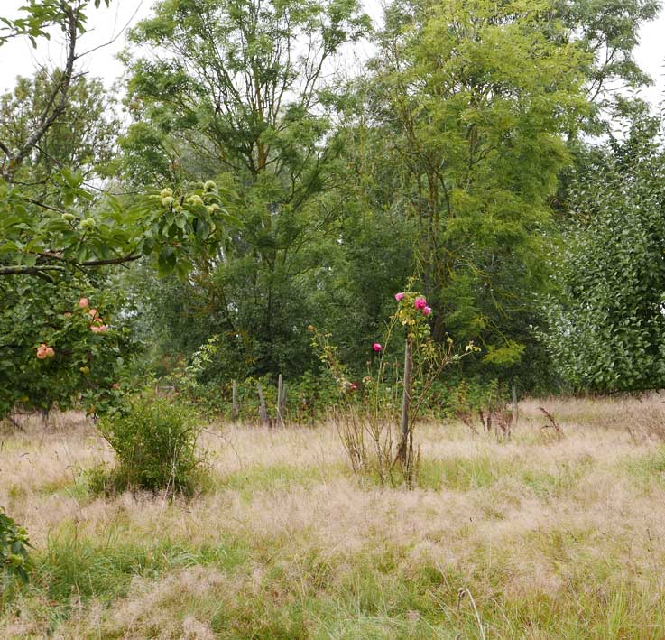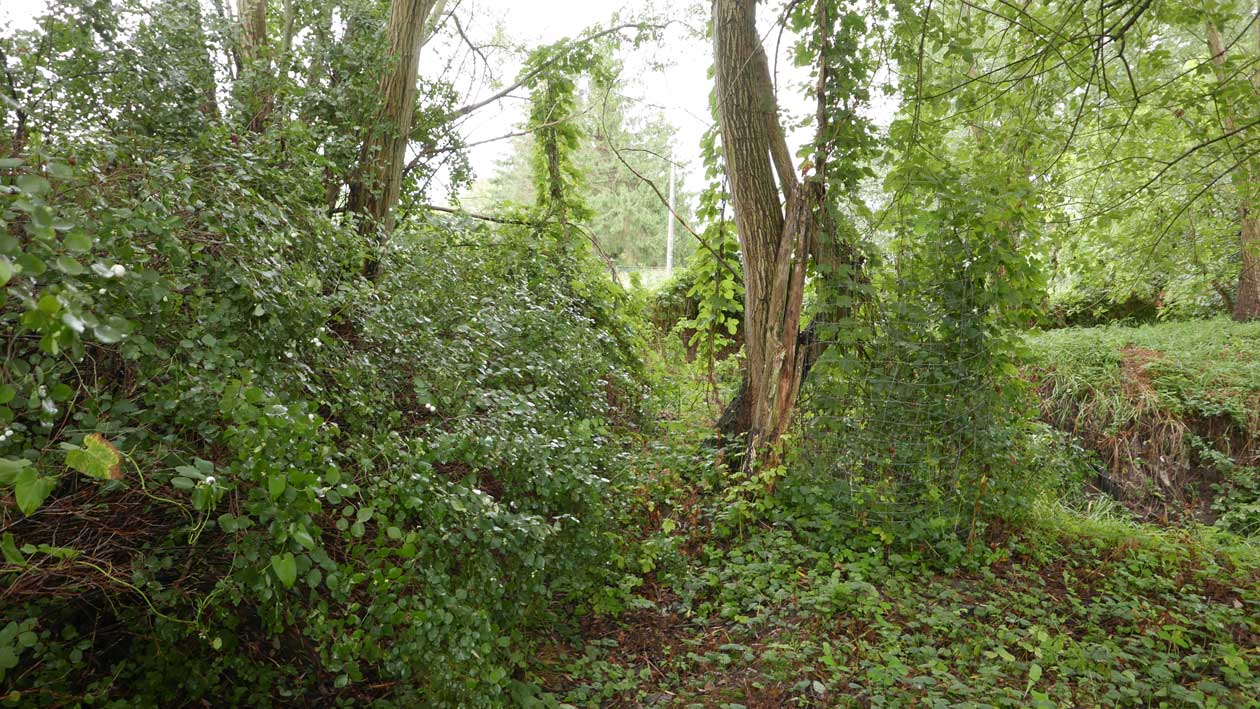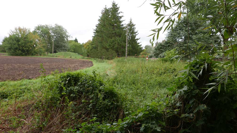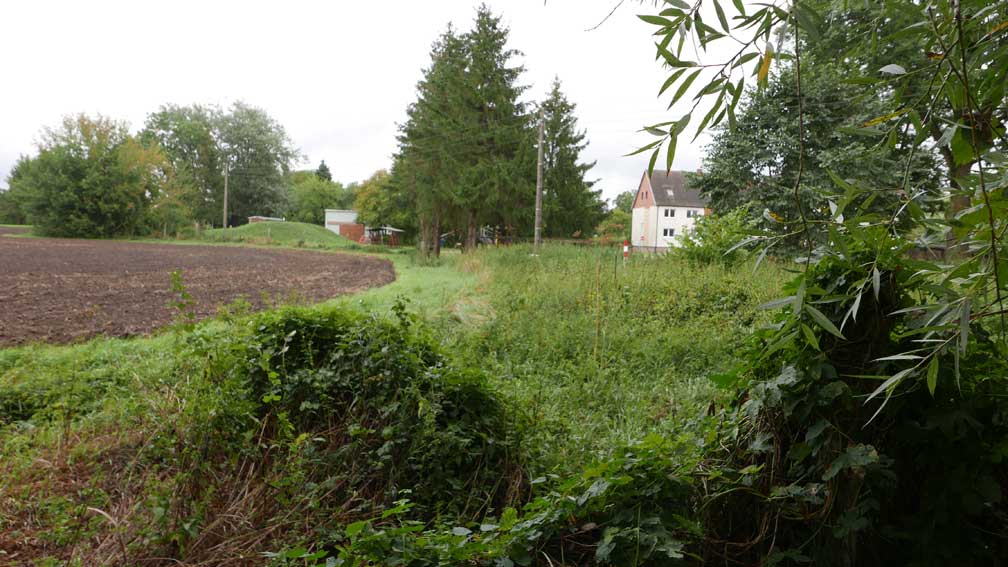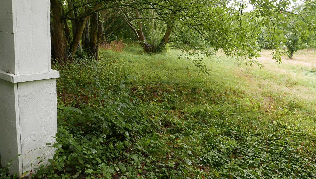 die Stelle des früheren Grabens am Zaun und vor den Bäumen