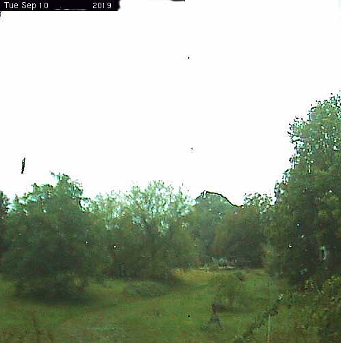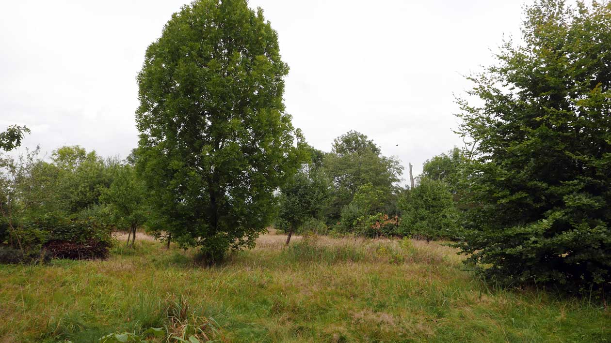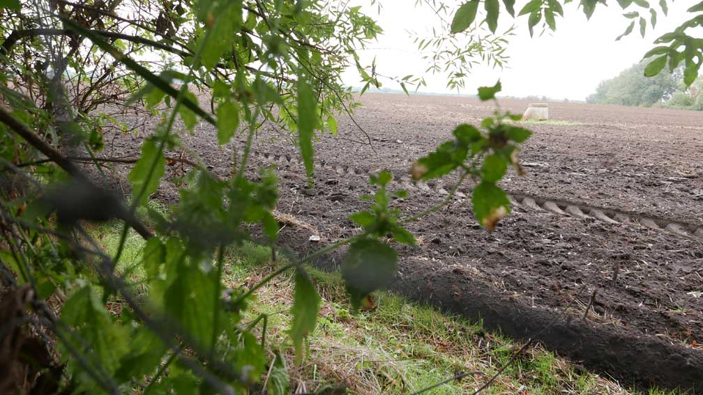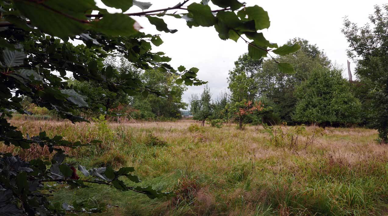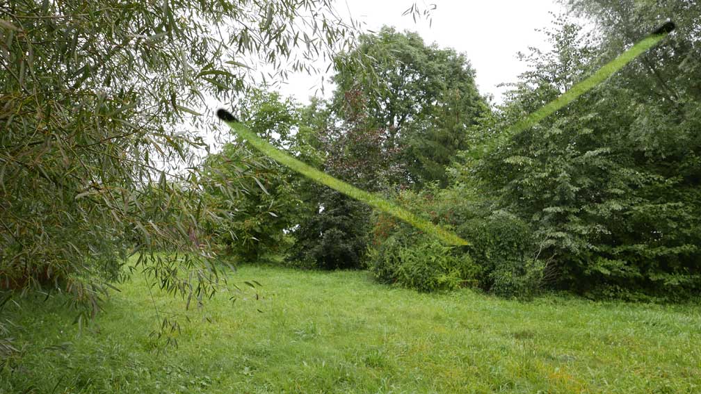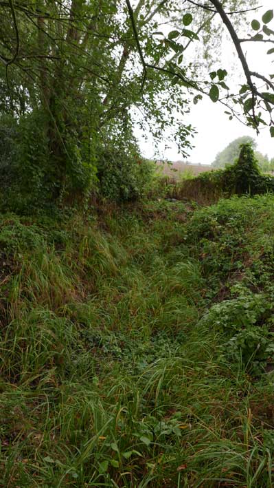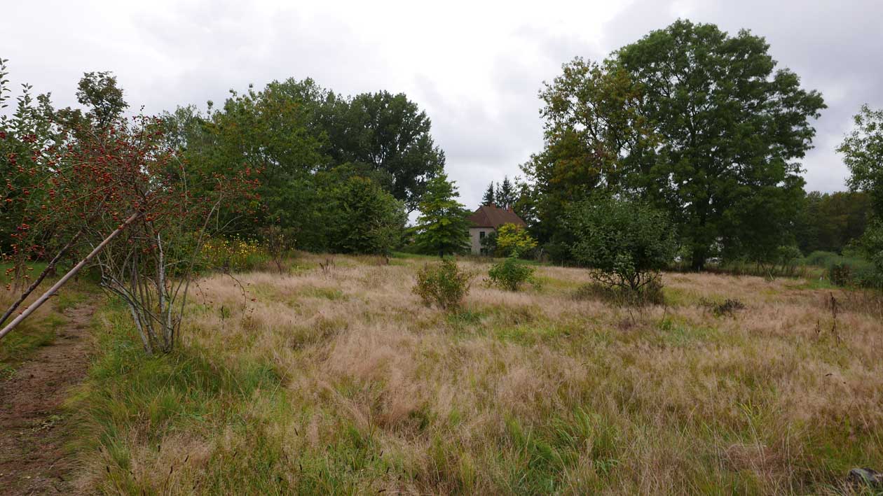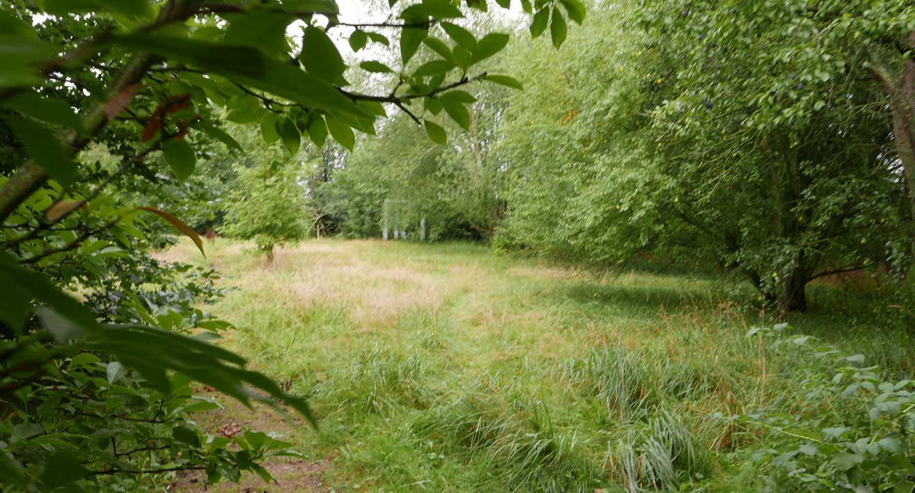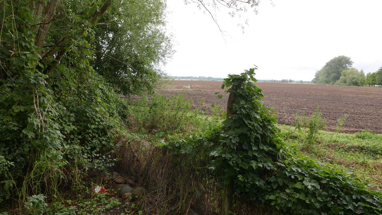 die Stelle des früheren Grabens am Zaun und vor den Bäumen