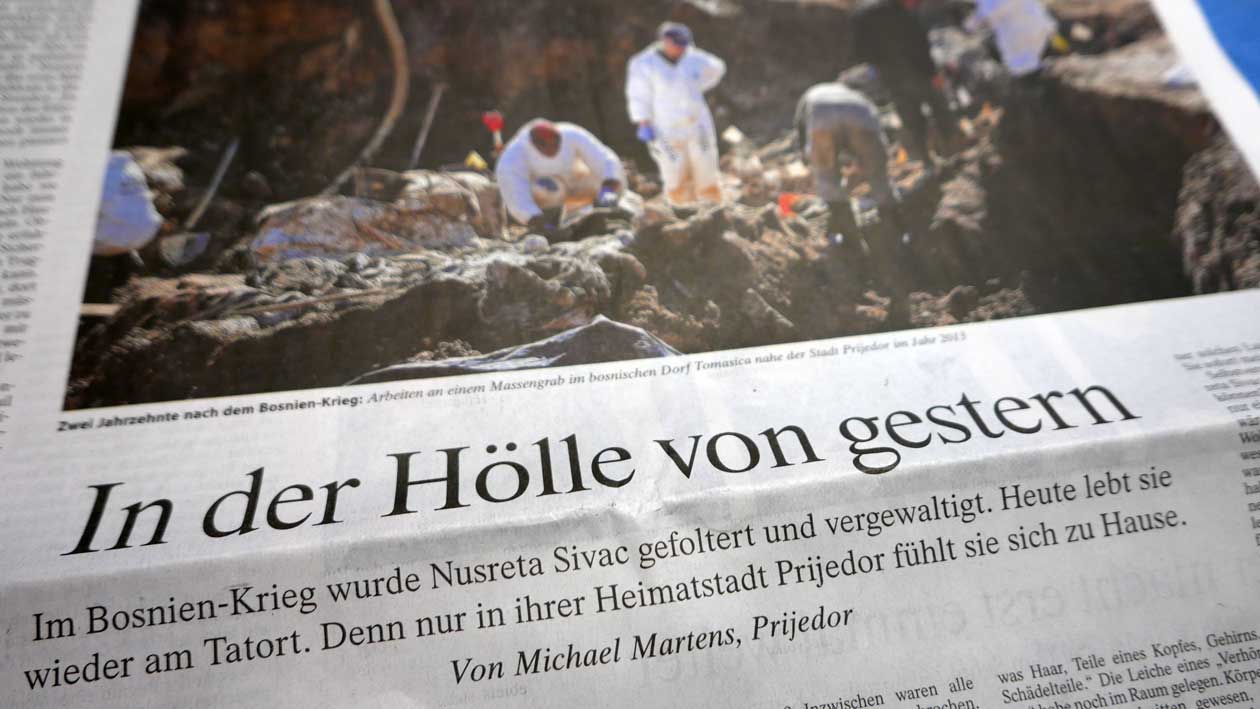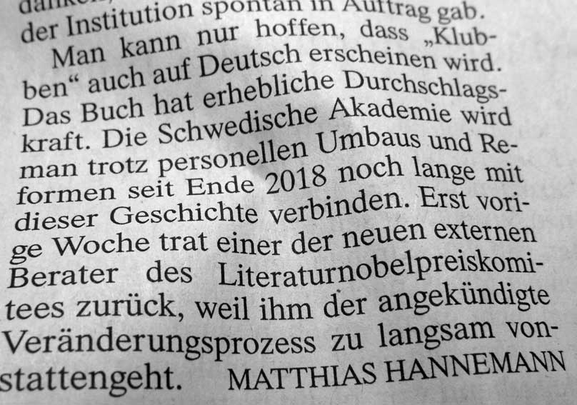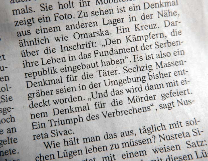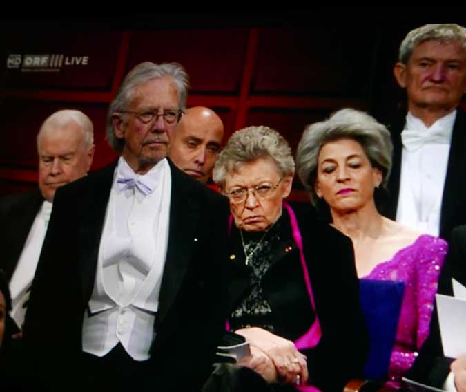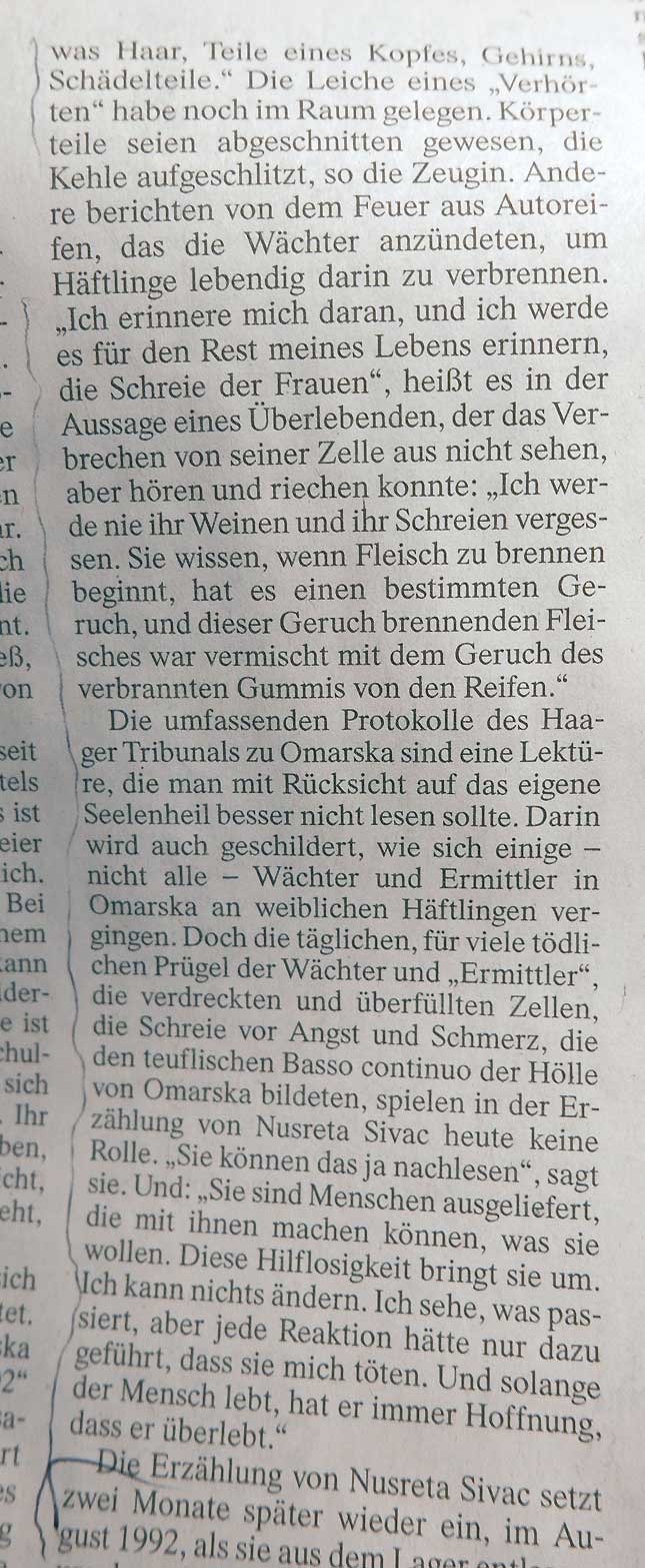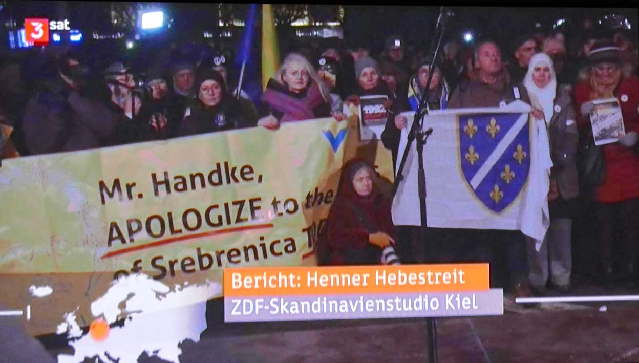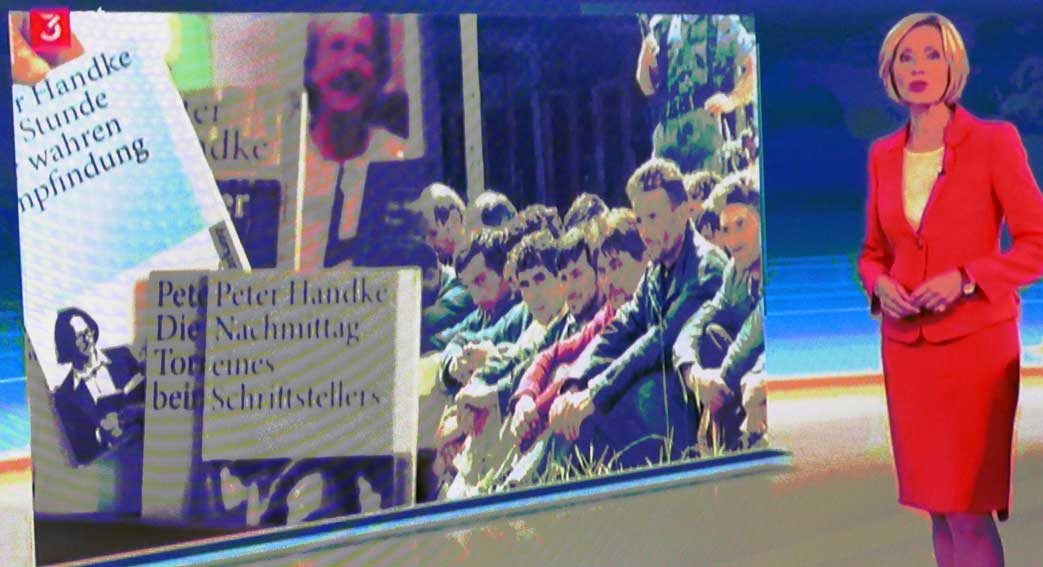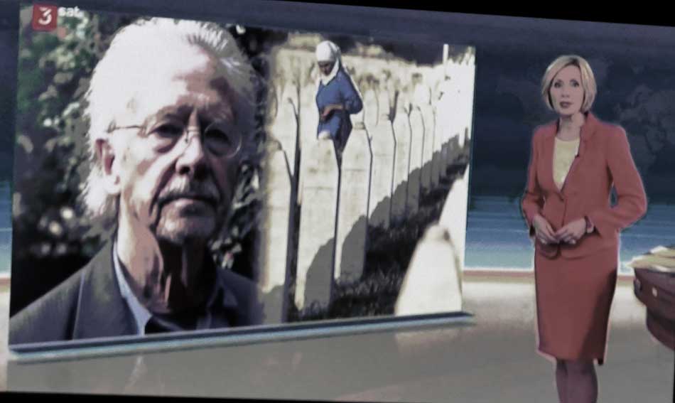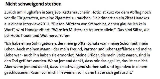 Dazwischen aber lag, sein Gang nach dem ehemaligen Jugoslawien. Und da waren, allen sichtbar, viele Tote entstanden und brennende Häuser, Flüchtende, Elend und Täter mit Namen und Gesichtern und Gräbern der Täter selbst. Zu denen er ging. Das er beschrieb, zu seiner Literatur gemacht, sie zur Poesie erklärte, Die nun hier gehrt wird. Von eben jenen, die er voher mit gestaltlosem Meinungsterror beschuldigte und deren Bilder von Müttern mit toten Kindern im Arm er kein Wort glauben wollte. Badend lachend vor der Kamera im berüchtigten Fluss der Leichen dieses Krieges.