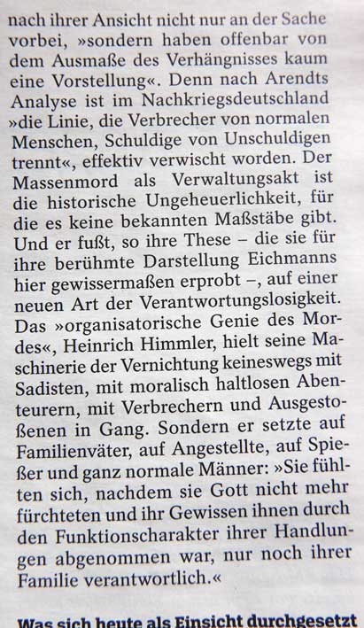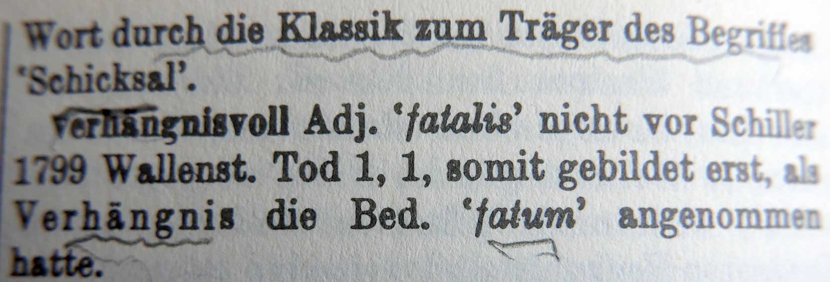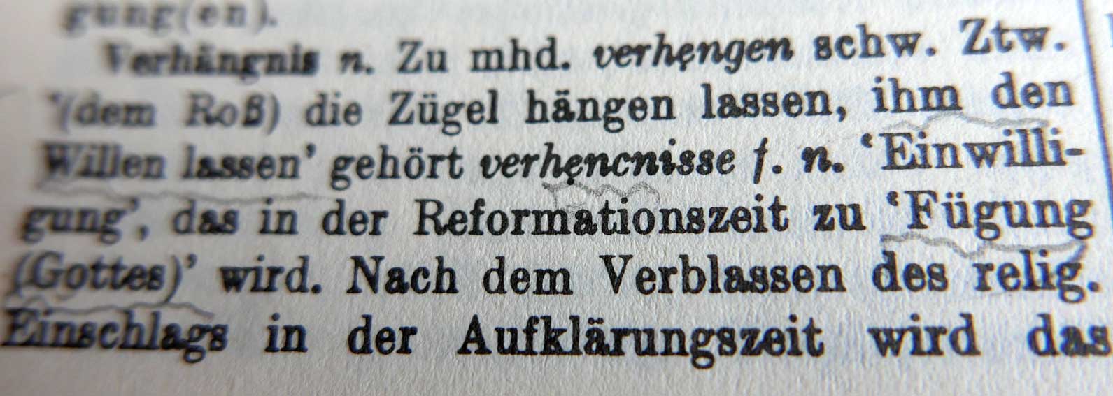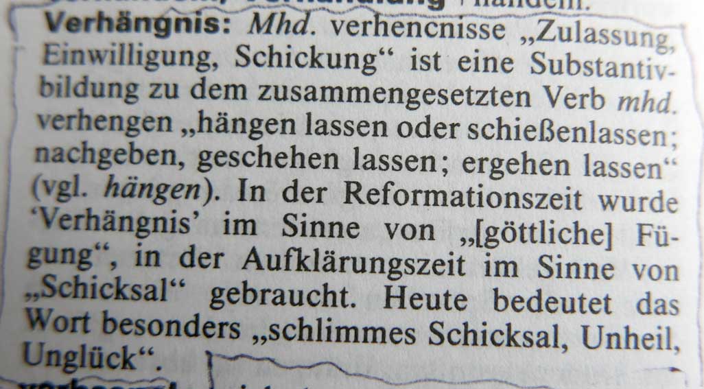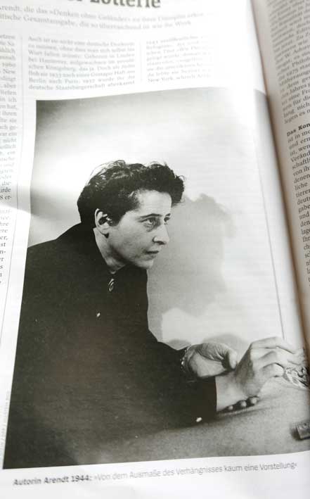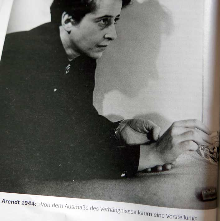 Die Gesamtausgabe von Hannah Arendt im SPIEGEL vorgestellt enthält das Wort Verhängnis für das, was damaks in Deutschland zwischen 1933 bis 45 geschah. Dies Wort ist -1944 im Krieg geschrieben- und überhaupt ungewöhnlich. Es bedarf genauer Deutung im ethym. Wörterbuch und im Duden. Wo wir bestätigt finden, was da ungewöhlich also nicht üblich seit 70 Jahren gesagt wird. Denn das - ernstgenommen - hätte Folgen. Auch und gerade für uns, wenn wir die Städte wieder aufbauen und neue Räume und Bilder wagen. Von Filmen, Theater und Büchern gar nicht zu reden.