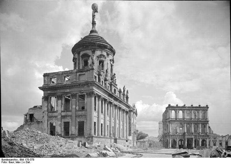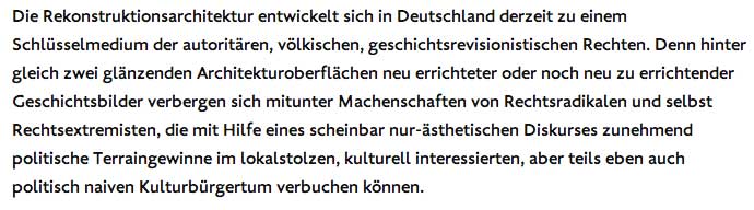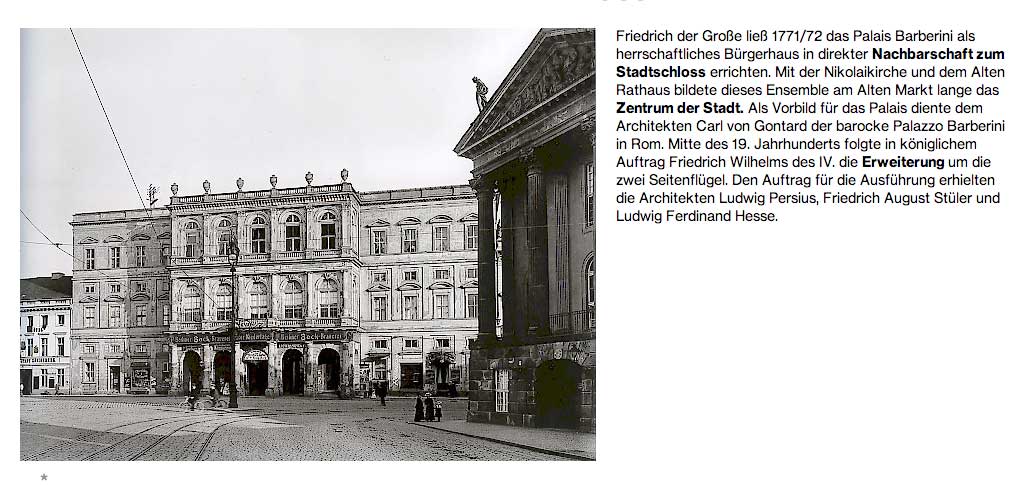 Nachkriegsbauten müssen weg. Mitten hinein ins Ensemble der Geschichte.Rechenzentrum auf den Grund der abgerissenen Garnisonskirche, Leherbilidungsanstalt der DDR auf den Alten Markt, Auf dem Schlossgrund die Stadt-Autobahn. Ja weg damit. Mauern fallend. Aber Verpflichtungen. keinen Gottesdienste wenn die G. Kirche wieder entsteht, Versöhnungs... statt hist. Details von 200 Jahren, DDR . Kunst im Pal. Baberini.